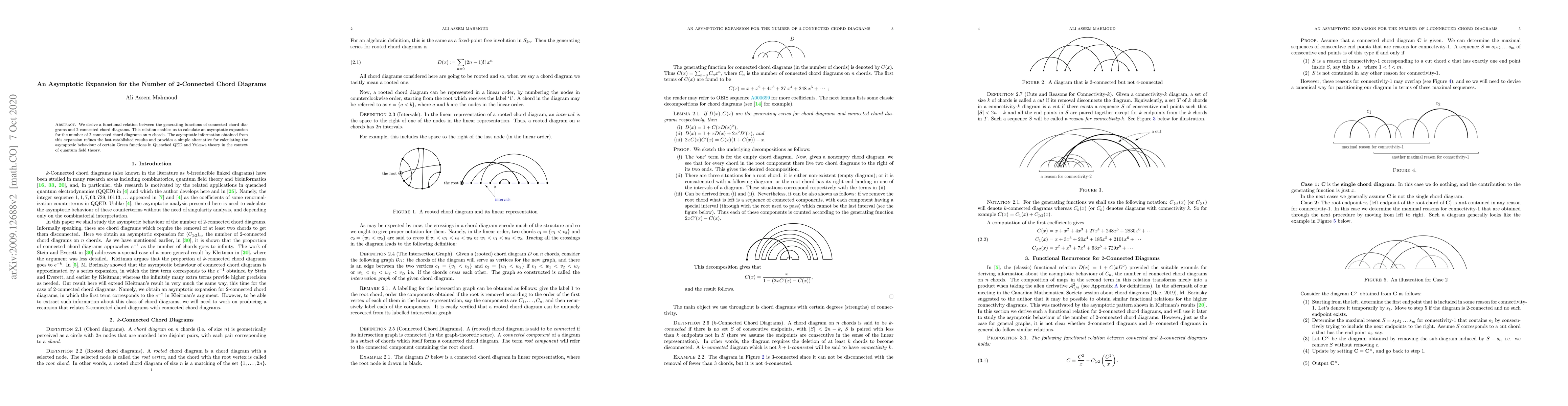 This paper derives a functional relation to calculate an asymptotic expansion for the number of 2-connected chord diagrams, refining previous results and offering a simpler method for determining the asymptotic behavior of certain Green functions in quantum field theory.