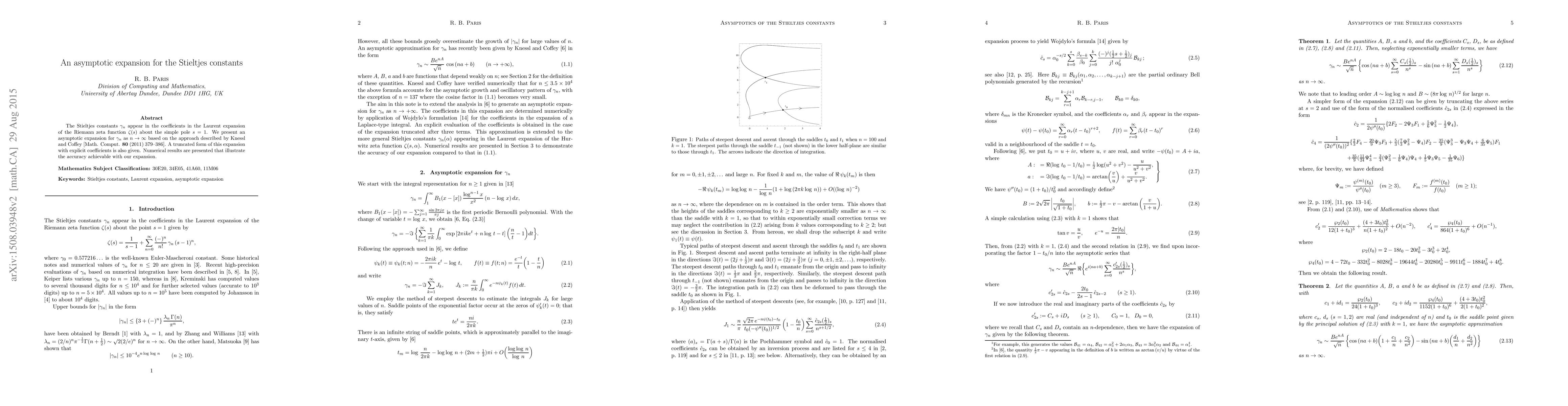 The Stieltjes constants $\gamma_n$ appear in the coefficients in the Laurent expansion of the Riemann zeta function $\zeta(s)$ about the simple pole $s=1$. We present an asymptotic expansion for $\gamma_n$ as $n\rightarrow \infty$ based on the approach described by Knessel and Coffey [Math. Comput. {\bf 80} (2011) 379--386]. A truncated form of this expansion with explicit coefficients is also given. Numerical results are presented that illustrate the accuracy achievable with our expansion.