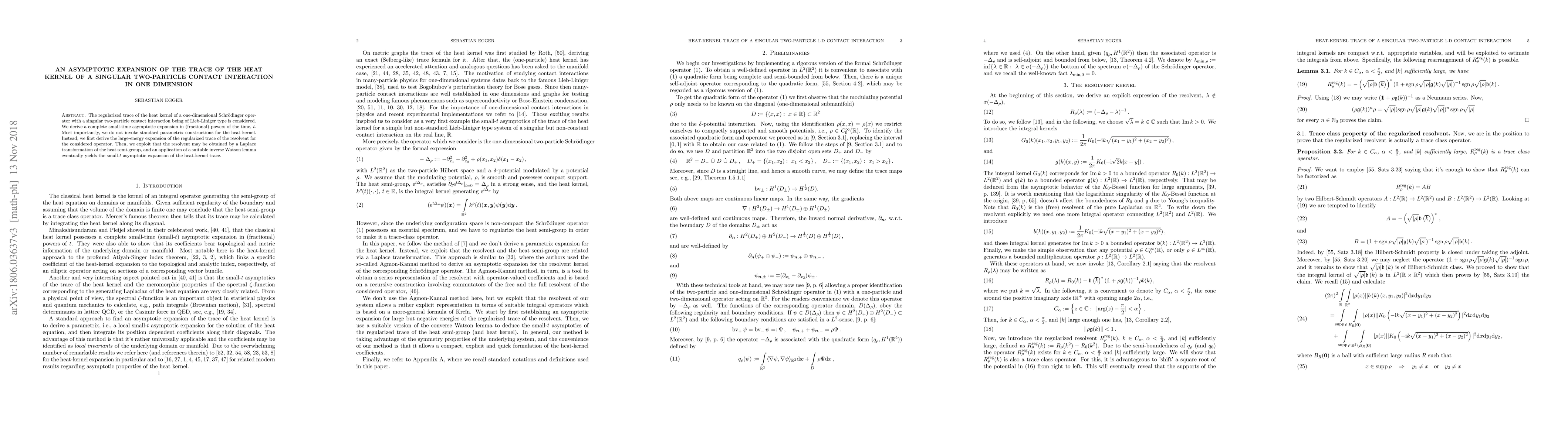 This paper derives a small-time asymptotic expansion for the trace of the heat kernel of a one-dimensional Schrödinger operator with a singular two-particle contact interaction. It avoids standard parametrix methods, instead deriving the expansion through a large-energy expansion of the resolvent and applying an inverse Watson lemma.