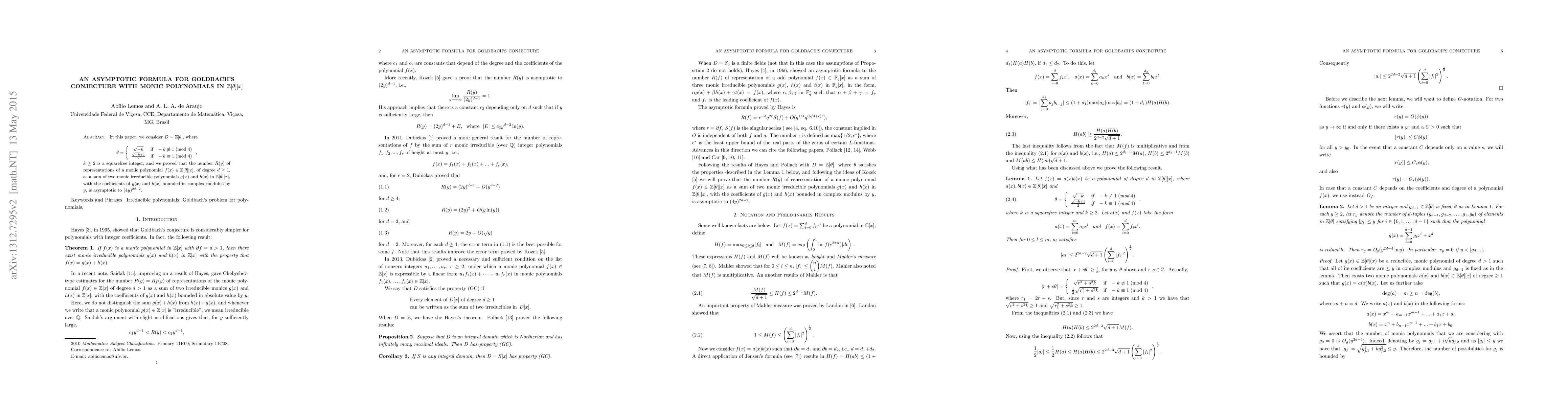 This paper proves an asymptotic formula for the number of representations of a monic polynomial in $\mathbb{Z}[\theta][x]$ as a sum of two monic irreducible polynomials, showing that $R(y)$ is asymptotically proportional to $(4y)^{2d-2}$. The field $D=\mathbb{Z}[\theta]$ is defined based on the squarefree integer $k$.
