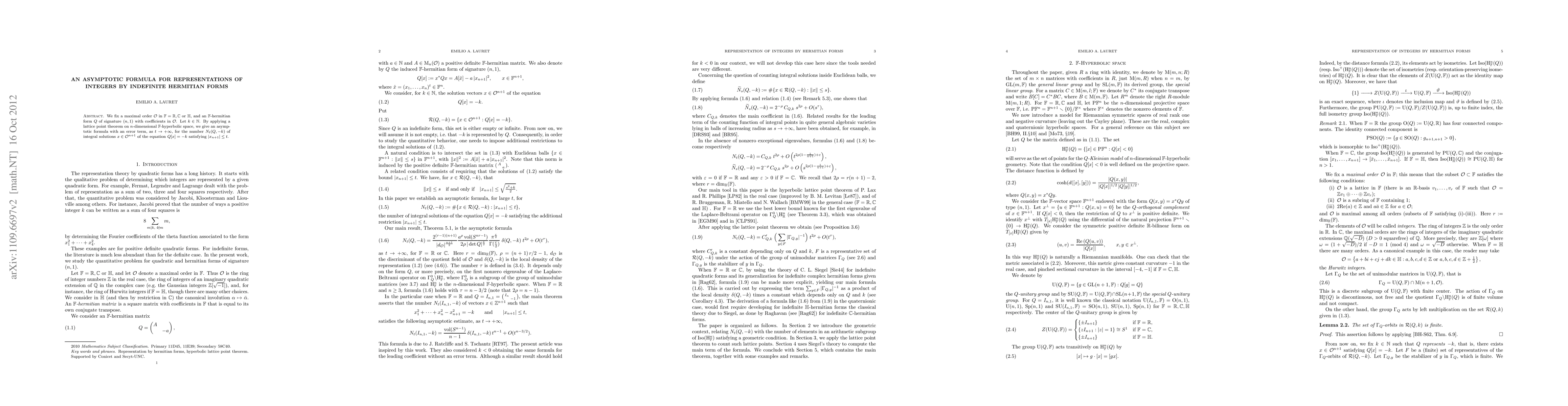 We fix a maximal order $\mathcal O$ in $\F=\R,\C$ or $\mathbb{H}$, and an $\F$-hermitian form $Q$ of signature $(n,1)$ with coefficients in $\mathcal O$. Let $k\in\N$. By applying a lattice point theorem on the $\F$-hyperbolic space, we give an asymptotic formula with an error term, as $t\to+\infty$, for the number $N_t(Q,-k)$ of integral solutions $x\in\mathcal O^{n+1}$ of the equation $Q[x]=-k$ satisfying $|x_{n+1}|\leq t$.