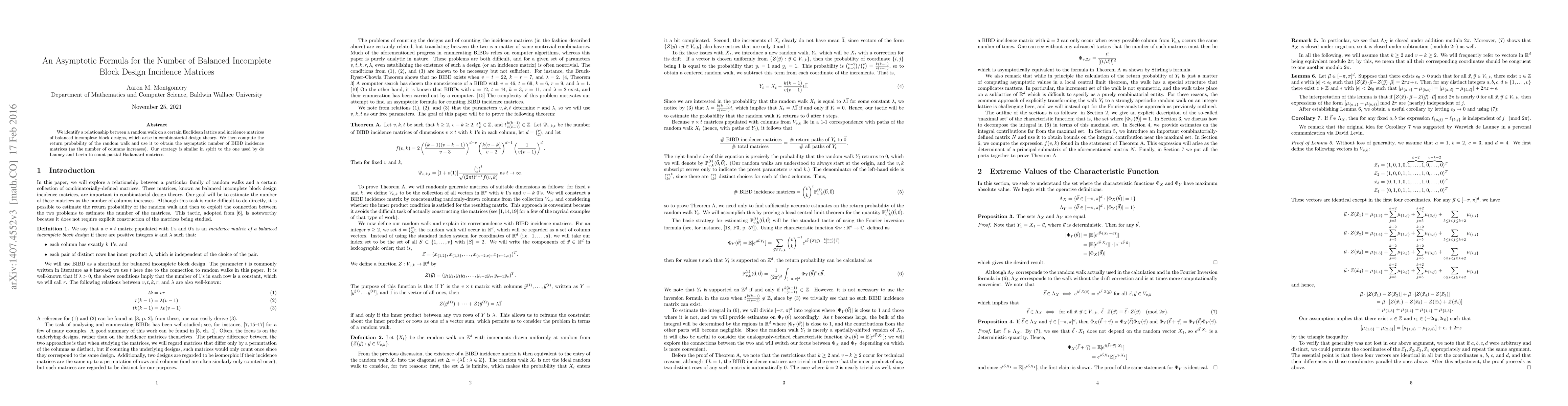 This paper establishes an asymptotic formula for the number of balanced incomplete block design (BIBD) incidence matrices by linking them to a random walk on a Euclidean lattice, and uses the return probability of this walk to derive the result, mirroring techniques used in counting partial Hadamard matrices.