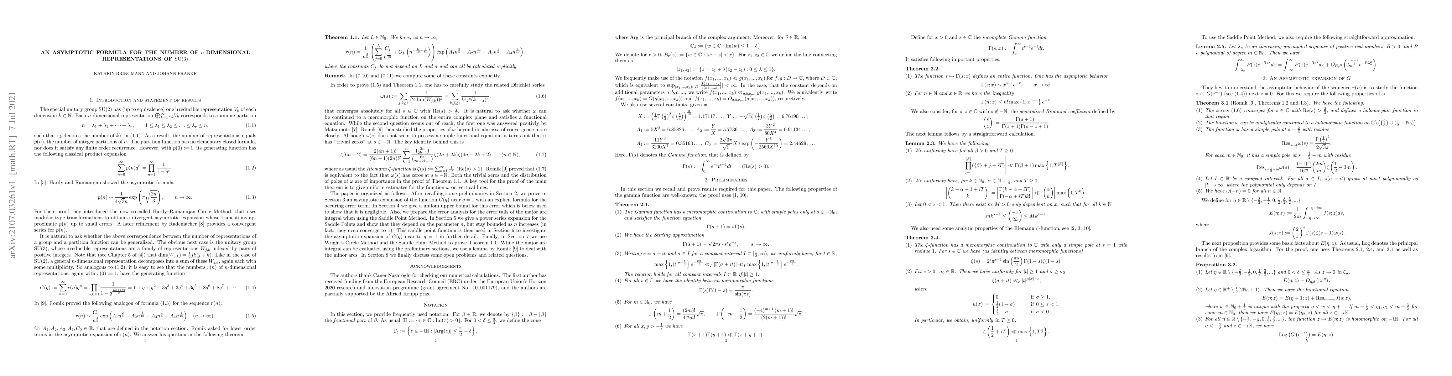 We prove an asymptotic formula for the number of $n$-dimensional representations of the group $\mathrm{SU}(3)$. Main tools for the proof are Wright's Circle Method and the Saddle Point Method.