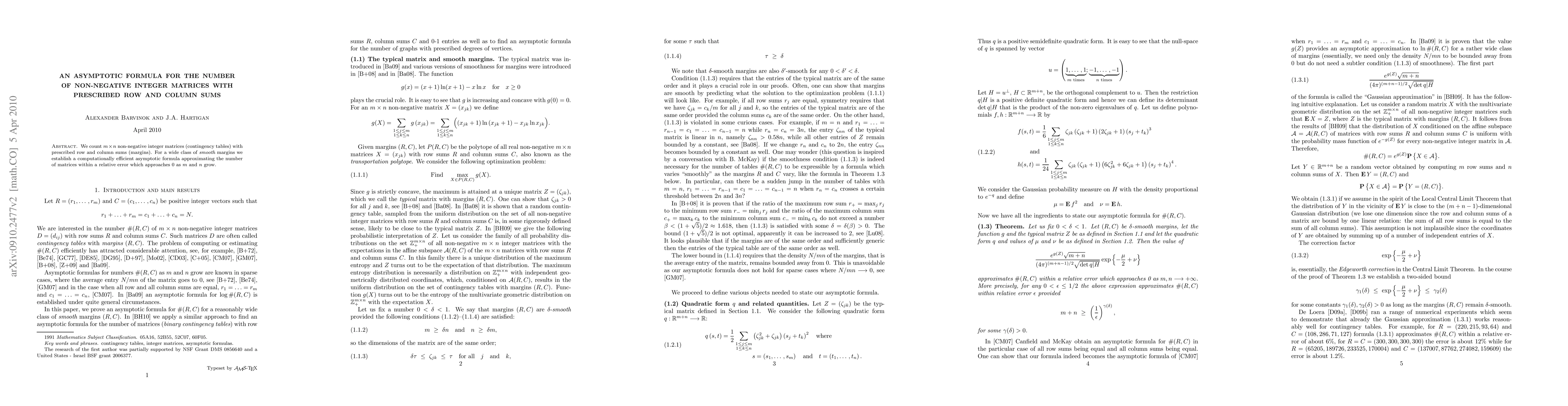 This paper derives an asymptotic formula to efficiently approximate the number of mxn non-negative integer matrices with given row and column sums, demonstrating relative error reduction as matrix dimensions increase. The approach applies to a broad range of smooth margins.
