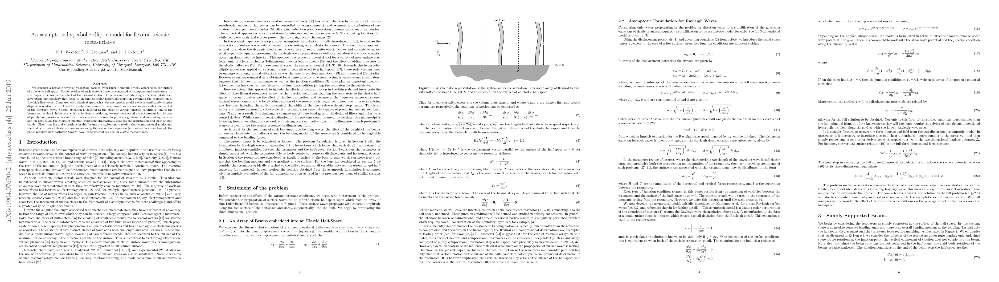 This paper develops an asymptotic hyperbolic-elliptic model for flexural-seismic metasurfaces composed of Euler-Bernoulli beams on an elastic half-space, showing simpler dispersion relations and significant effects of junction conditions on stop band distributions.