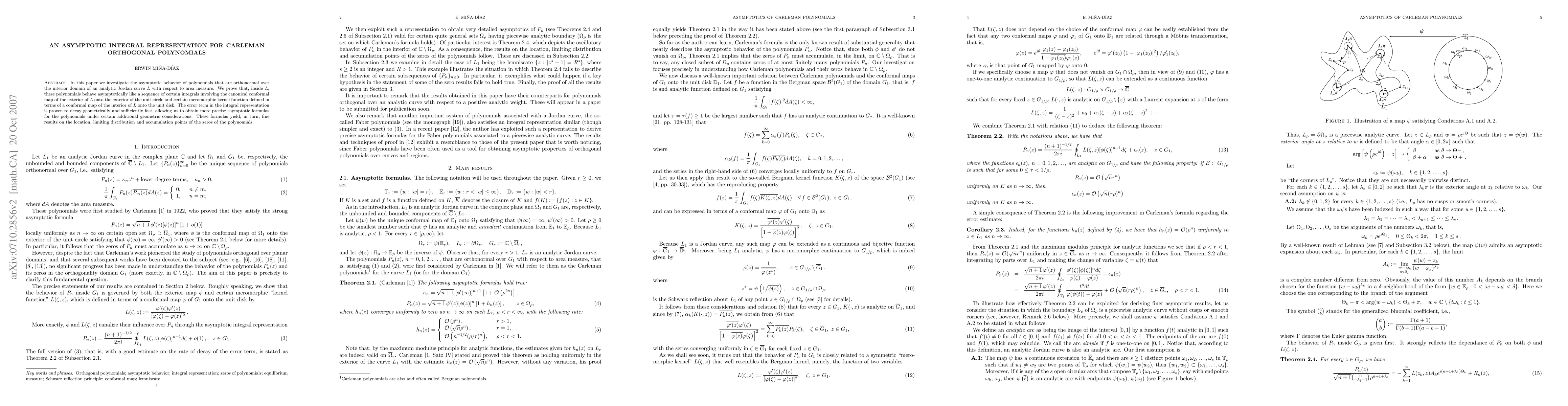 This paper provides an asymptotic integral representation for Carleman orthogonal polynomials defined over the interior of an analytic Jordan curve, showing they behave like specific integrals involving conformal maps and a meromorphic kernel function. The error term is shown to decay geometrically, leading to precise asymptotic formulas and insights into the zeros' distribution.