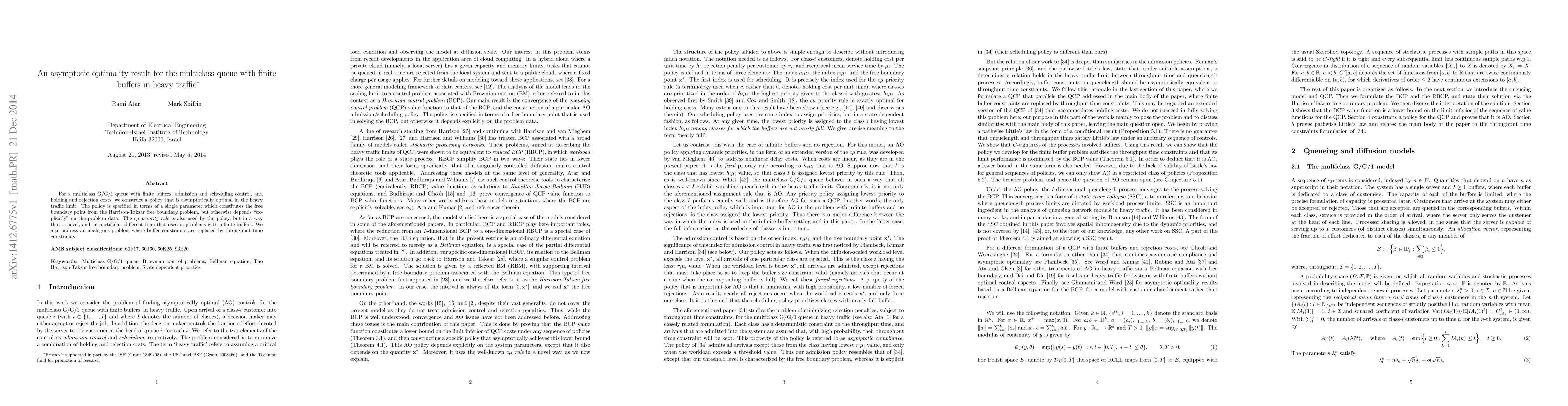 For a multiclass G/G/1 queue with finite buffers, admission and scheduling control, and holding and rejection costs, we construct a policy that is asymptotically optimal in the heavy traffic limit. The policy is specified in terms of a single parameter which constitutes the free boundary point from the Harrison-Taksar free boundary problem, but otherwise depends "explicitly" on the problem data. The c mu priority rule is also used by the policy, but in a way that is novel, and, in particular, different than that used in problems with infinite buffers. We also address an analogous problem where buffer constraints are replaced by throughput time constraints.