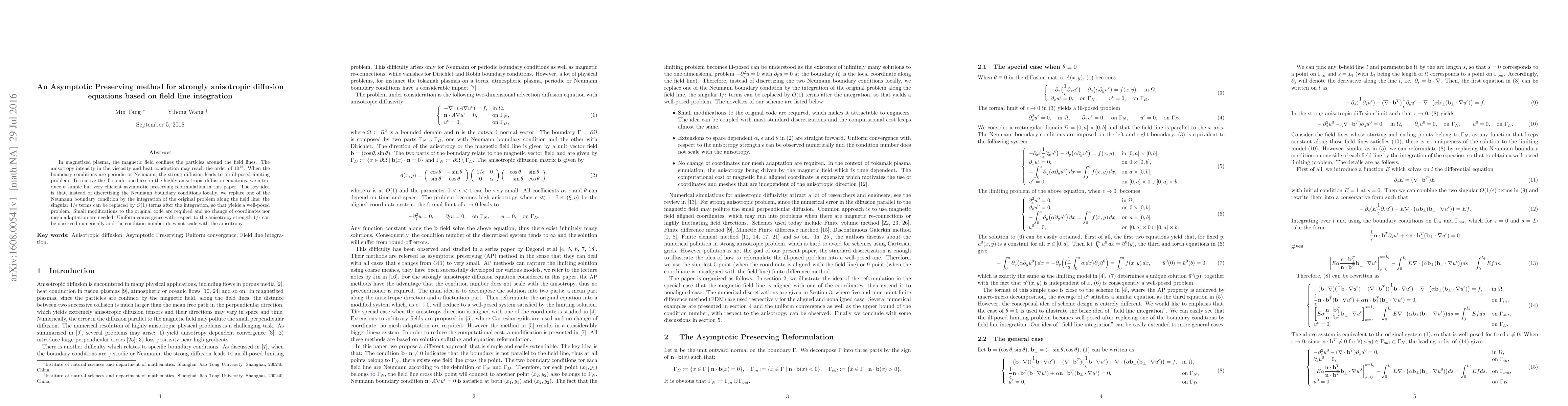 In magnetized plasma, the magnetic field confines the particles around the field lines. The anisotropy intensity in the viscosity and heat conduction may reach the order of $10^{12}$. When the boundary conditions are periodic or Neumann, the strong diffusion leads to an ill-posed limiting problem. To remove the ill-conditionedness in the highly anisotropic diffusion equations, we introduce a simple but very efficient asymptotic preserving reformulation in this paper. The key idea is that, instead of discretizing the Neumann boundary conditions locally, we replace one of the Neumann boundary condition by the integration of the original problem along the field line, the singular $1/\epsilon$ terms can be replaced by $O(1)$ terms after the integration, so that yields a well-posed problem. Small modifications to the original code are required and no change of coordinates nor mesh adaptation are needed. Uniform convergence with respect to the anisotropy strength $1/\epsilon$ can be observed numerically and the condition number does not scale with the anisotropy.