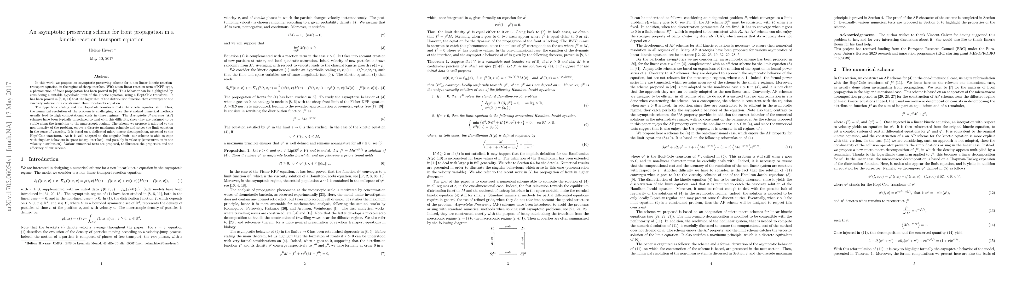 This paper proposes an Asymptotic Preserving (AP) scheme for solving a kinetic reaction-transport equation with sharp interface front propagation. The scheme, based on a micro-macro decomposition and Hopf-Cole transform, is designed to efficiently handle the stiff nature of the problem and maintains stability across the transition to the macroscopic regime.
