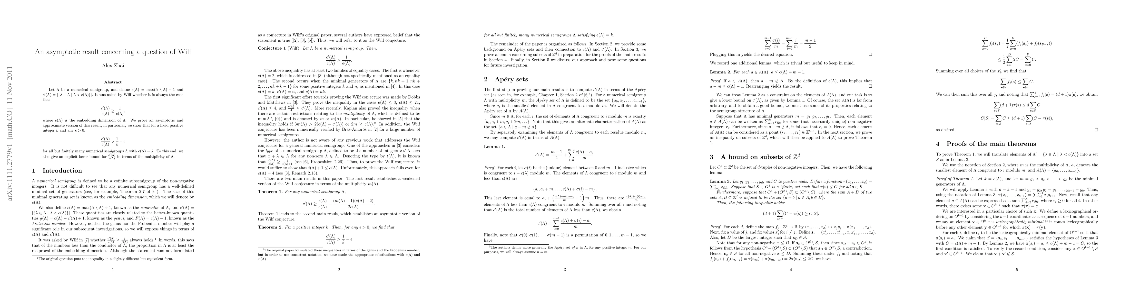 Let $\Lambda$ be a numerical semigroup with embedding dimension $e(\Lambda)$. Define $c(\Lambda)$ to be one plus the largest integer not in $\Lambda$, and define $c'(\Lambda)$ to be the number of elements in $\Lambda$ less than $c(\Lambda)$. It was asked by Wilf whether $\frac{c'(\Lambda)}{c(\Lambda)} \ge \frac{1}{e(\Lambda)}$ always holds. We prove an asymptotic version of this conjecture: we show that for a fixed positive integer $k$ and any $\epsilon > 0$, the inequality $\frac{c'(\Lambda)}{c(\Lambda)} \ge \frac{1}{k} - \epsilon$ holds for all but finitely many numerical semigroups $\Lambda$ satisfying $e(\Lambda) = k$.