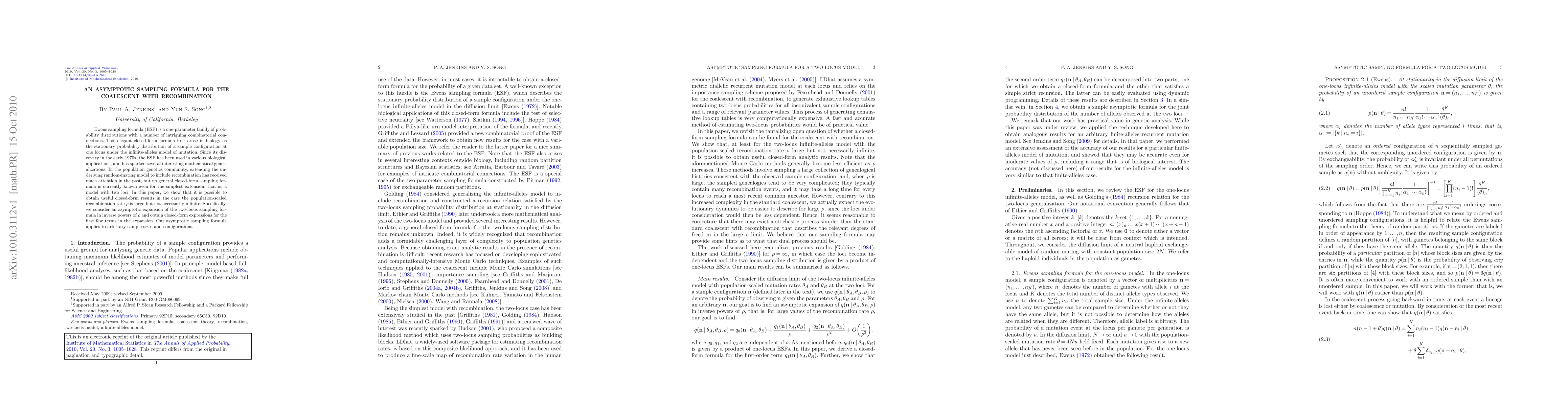This paper develops an asymptotic sampling formula for the coalescent with recombination, providing closed-form expressions for the first few terms in an expansion when the population-scaled recombination rate is large. This approach extends the Ewens sampling formula to include recombination effects, applicable to various sample sizes and configurations.
