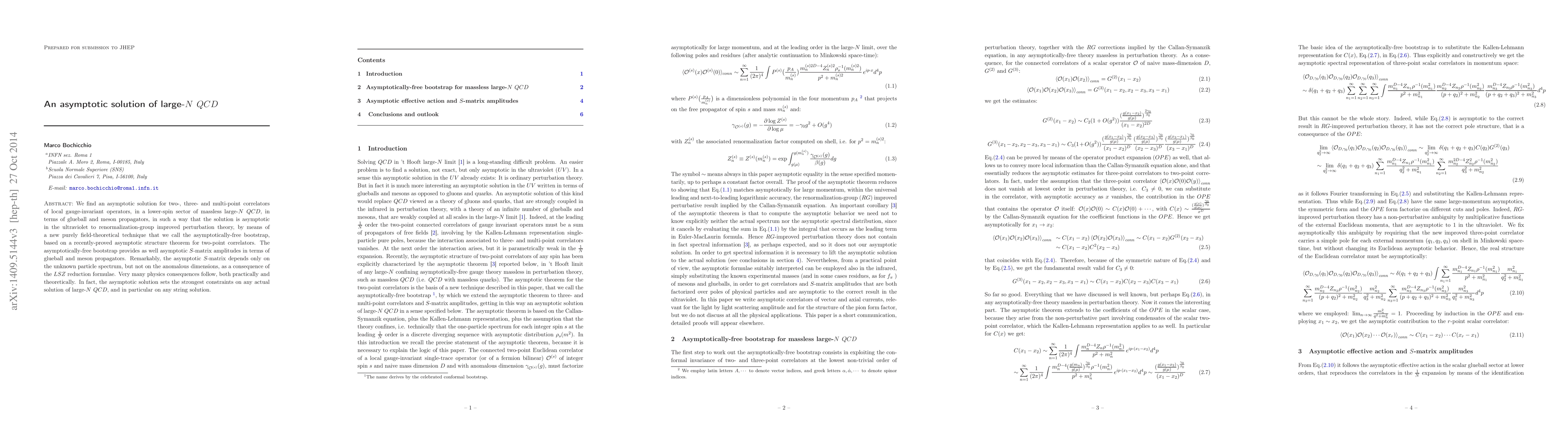 We find an asymptotic solution for two-, three- and multi-point correlators of local gauge-invariant operators, in a lower-spin sector of massless large-$N$ $QCD$, in terms of glueball and meson propagators, in such a way that the solution is asymptotic in the ultraviolet to renormalization-group improved perturbation theory, by means of a new purely field-theoretical technique that we call the asymptotically-free bootstrap, based on a recently-proved asymptotic structure theorem for two-point correlators. The asymptotically-free bootstrap provides as well asymptotic $S$-matrix amplitudes in terms of glueball and meson propagators. Remarkably, the asymptotic $S$-matrix depends only on the unknown particle spectrum, but not on the anomalous dimensions, as a consequence of the $LSZ$ reduction formulae. Very many physics consequences follow, both practically and theoretically. In fact, the asymptotic solution sets the strongest constraints on any actual solution of large-$N$ $QCD$, and in particular on any string solution.