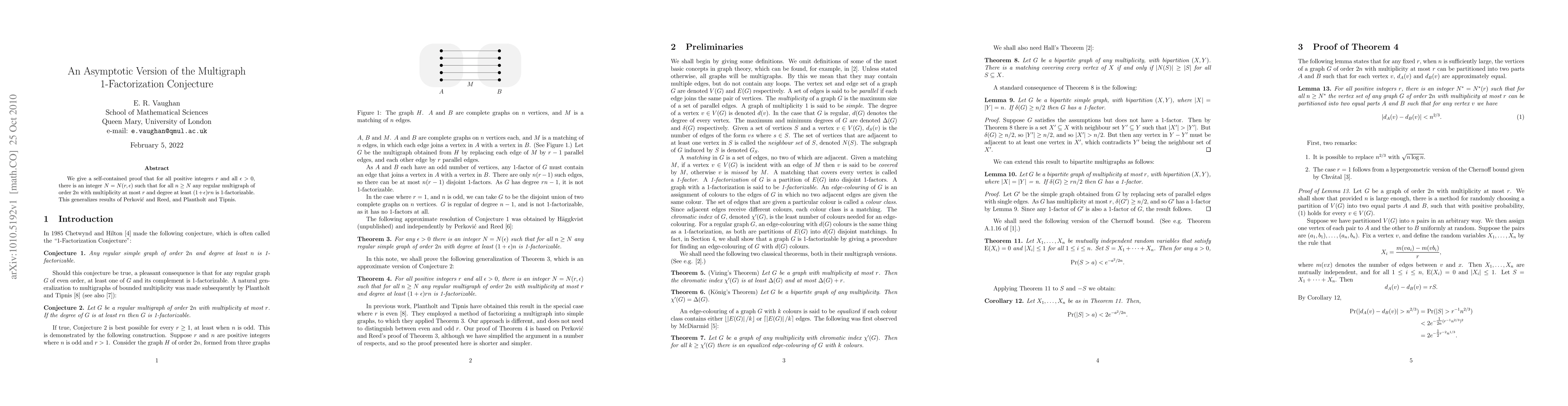 We give a self-contained proof that for all positive integers $r$ and all $\epsilon > 0$, there is an integer $N = N(r, \epsilon)$ such that for all $n \ge N$ any regular multigraph of order $2n$ with multiplicity at most $r$ and degree at least $(1+\epsilon)rn$ is 1-factorizable. This generalizes results of Perkovi{\'c} and Reed, and Plantholt and Tipnis.