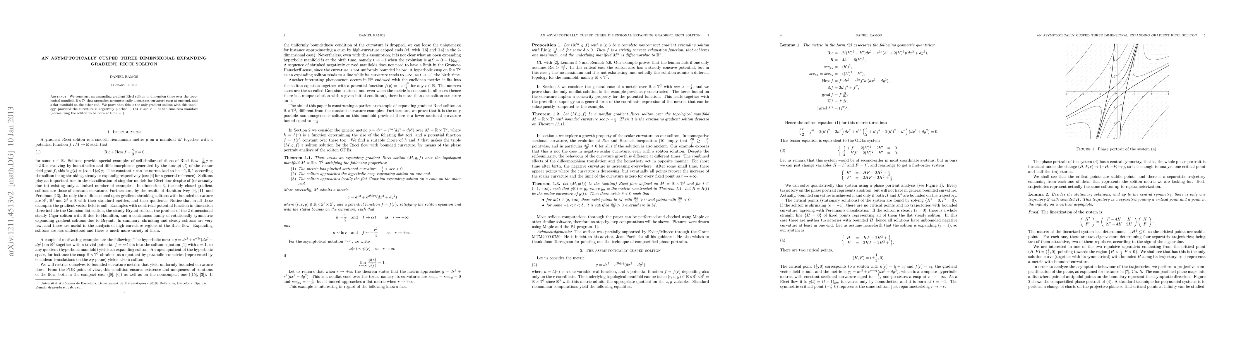 We construct an expanding gradient Ricci soliton in dimension three over the topological manifold R x T^2 (the product of a line and a torus) that aproaches asymptotically a constant curvature cusp at one end, and a flat manifold on the other end. We prove that this is the only gradient soliton with this topology, provided the curvature is negatively pinched, -1/4 < sec < 0, at the time-zero manifold (normalizing the soliton to be born at time -1).