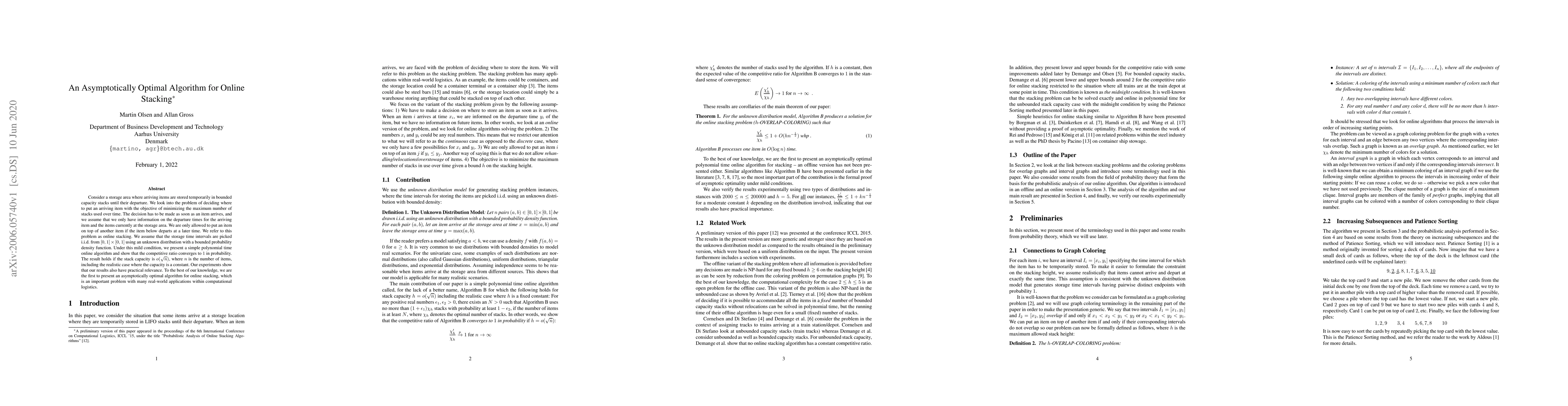 Consider a storage area where arriving items are stored temporarily in bounded capacity stacks until their departure. We look into the problem of deciding where to put an arriving item with the objective of minimizing the maximum number of stacks used over time. The decision has to be made as soon as an item arrives, and we assume that we only have information on the departure times for the arriving item and the items currently at the storage area. We are only allowed to put an item on top of another item if the item below departs at a later time. We refer to this problem as online stacking. We assume that the storage time intervals are picked i.i.d. from $[0, 1] \times [0, 1]$ using an unknown distribution with a bounded probability density function. Under this mild condition, we present a simple polynomial time online algorithm and show that the competitive ratio converges to $1$ in probability. The result holds if the stack capacity is $o(\sqrt{n})$, where $n$ is the number of items, including the realistic case where the capacity is a constant. Our experiments show that our results also have practical relevance. To the best of our knowledge, we are the first to present an asymptotically optimal algorithm for online stacking, which is an important problem with many real-world applications within computational logistics.