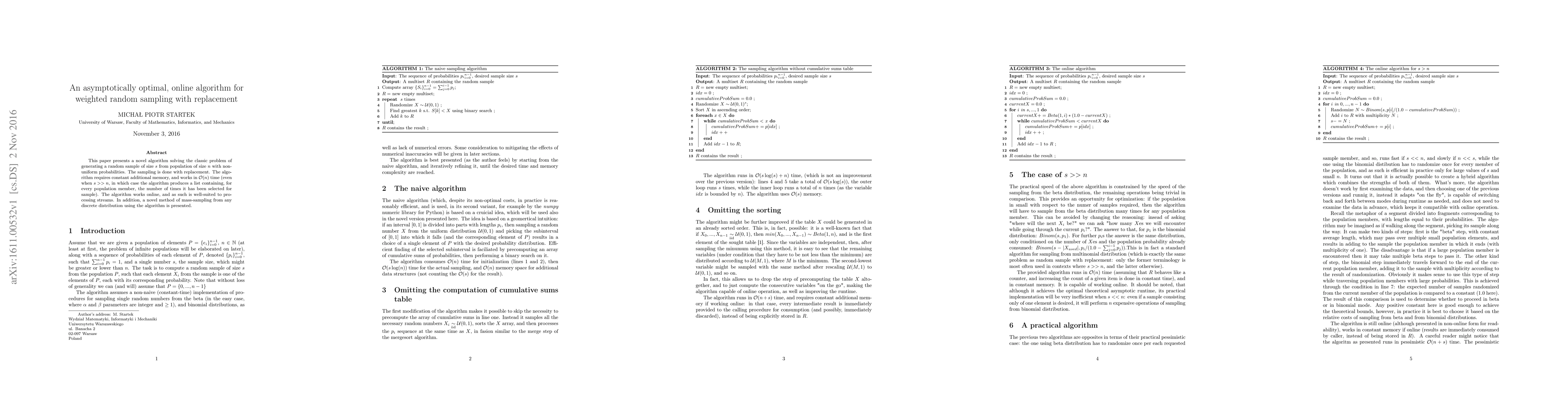 This paper introduces an efficient online algorithm for weighted random sampling with replacement, requiring constant memory and O(n) time. It is particularly suited for streaming data and includes a method for mass-sampling from any discrete distribution.