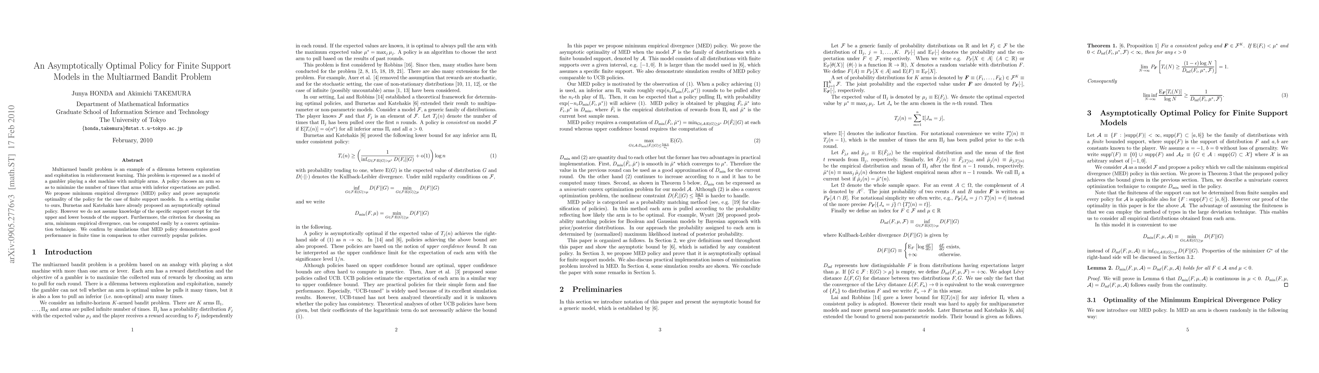 This paper proposes a minimum empirical divergence (MED) policy for the multiarmed bandit problem, proving its asymptotic optimality for finite support models. Unlike existing methods, MED uses a dual criterion computed via convex optimization, offering practical advantages, and simulations show its superior performance in finite time.