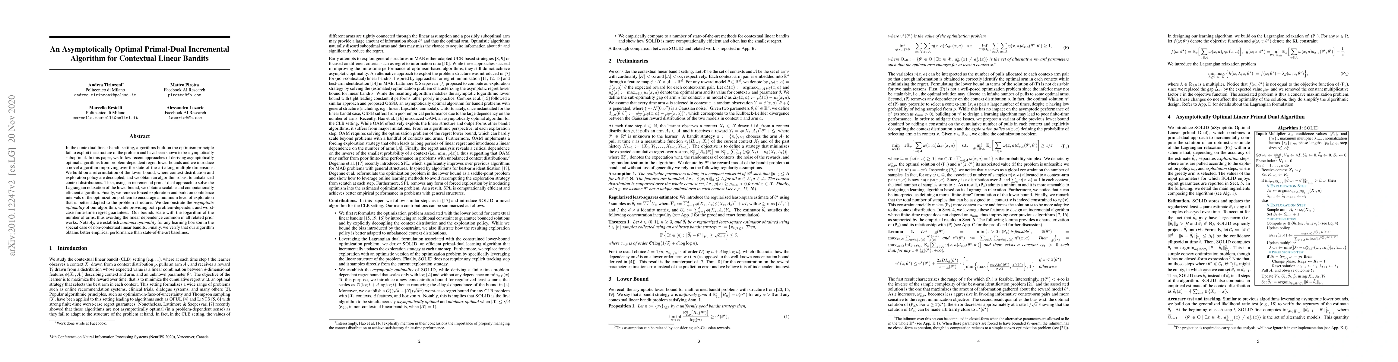 This paper introduces a novel asymptotically optimal incremental primal-dual algorithm for contextual linear bandits, improving upon previous approaches by decoupling context distribution and exploration policy. The algorithm achieves better-adapted exploration and provides improved regret guarantees, scaling logarithmically with the number of arms.