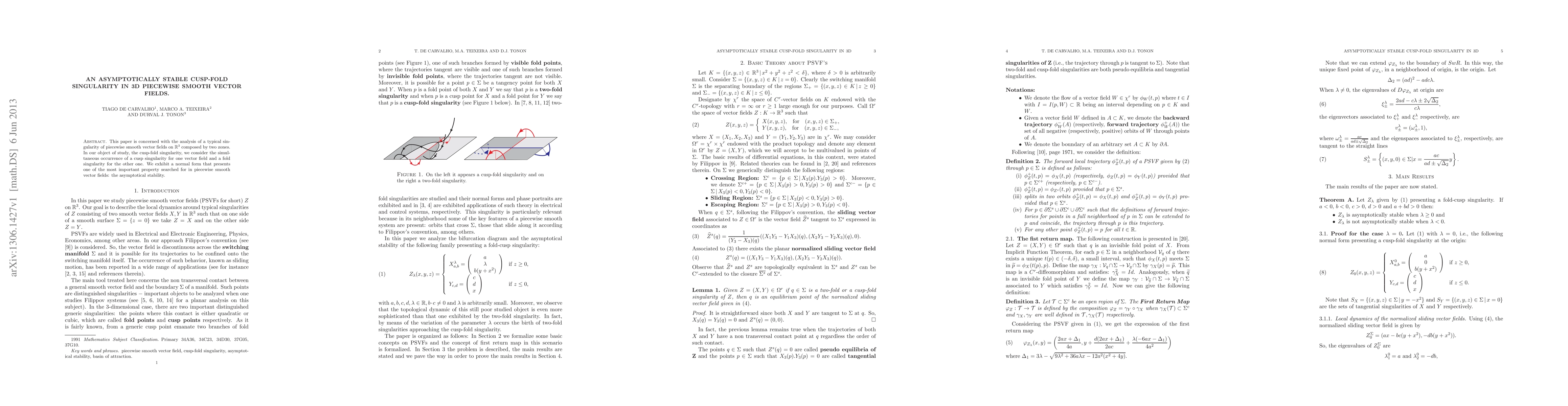 This paper analyzes a cusp-fold singularity in 3D piecewise smooth vector fields, demonstrating asymptotic stability through a normal form. The study focuses on a unique configuration where one vector field exhibits a cusp singularity and the other a fold singularity.