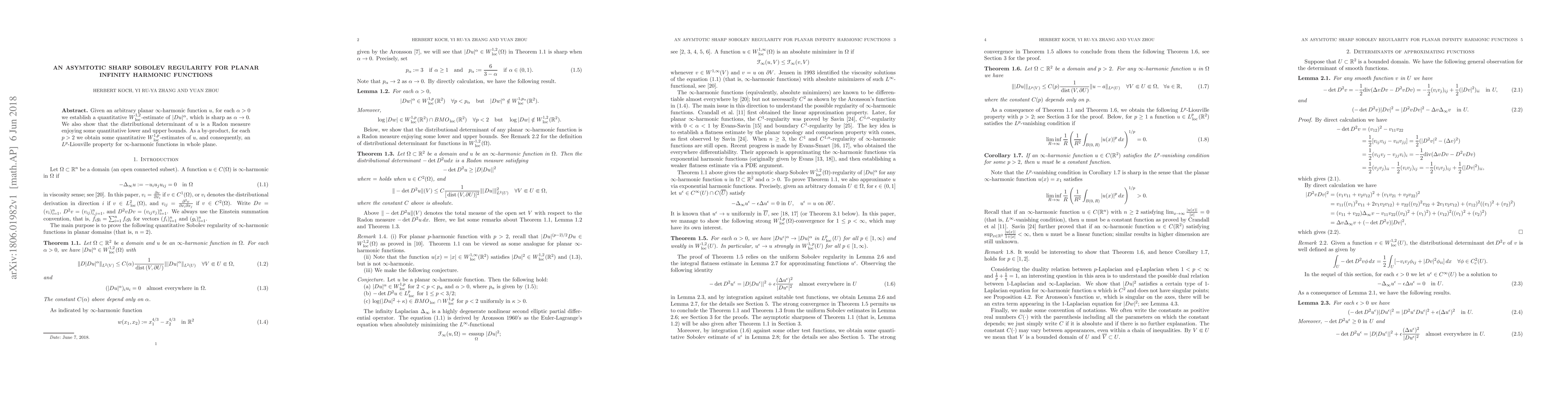 This paper establishes a sharp local $W^{1,2}$-estimate for planar $ extit{infinity}$ harmonic functions as the angularity goes to 0, alongside quantitative bounds on their distributional determinant.