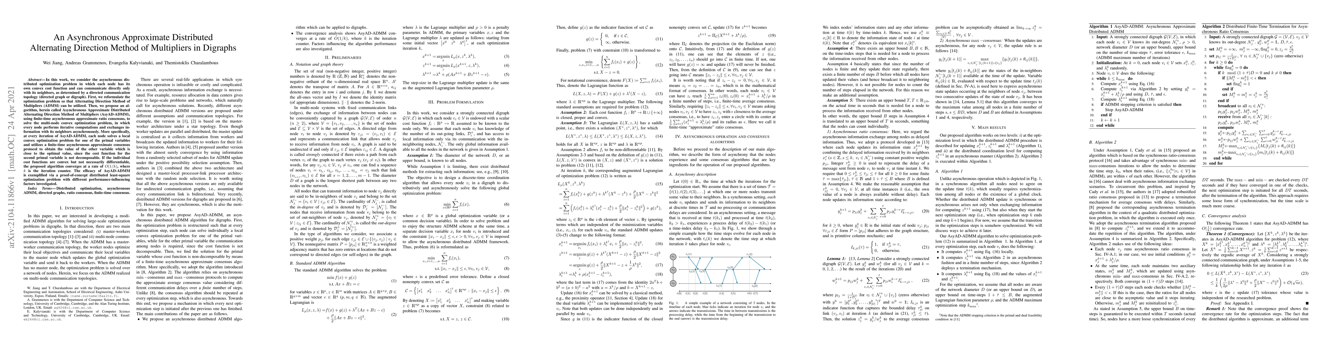 In this work, we consider the asynchronous distributed optimization problem in which each node has its own convex cost function and can communicate directly only with its neighbors, as determined by a directed communication topology (directed graph or digraph). First, we reformulate the optimization problem so that Alternating Direction Method of Multipliers (ADMM) can be utilized. Then, we propose an algorithm, herein called Asynchronous Approximate Distributed Alternating Direction Method of Multipliers (AsyAD-ADMM), using finite-time asynchronous approximate ratio consensus, to solve the multi-node convex optimization problem, in which every node performs iterative computations and exchanges information with its neighbors asynchronously. More specifically, at every iteration of AsyAD-ADMM, each node solves a local convex optimization problem for one of the primal variables and utilizes a finite-time asynchronous approximate consensus protocol to obtain the value of the other variable which is close to the optimal value, since the cost function for the second primal variable is not decomposable. If the individual cost functions are convex but not necessarily differentiable, the proposed algorithm converges at a rate of $\mathcal{O}(1/k)$, where $k$ is the iteration counter. The efficacy of AsyAD-ADMM is exemplified via a proof-of-concept distributed least-square optimization problem with different performance-influencing factors investigated.