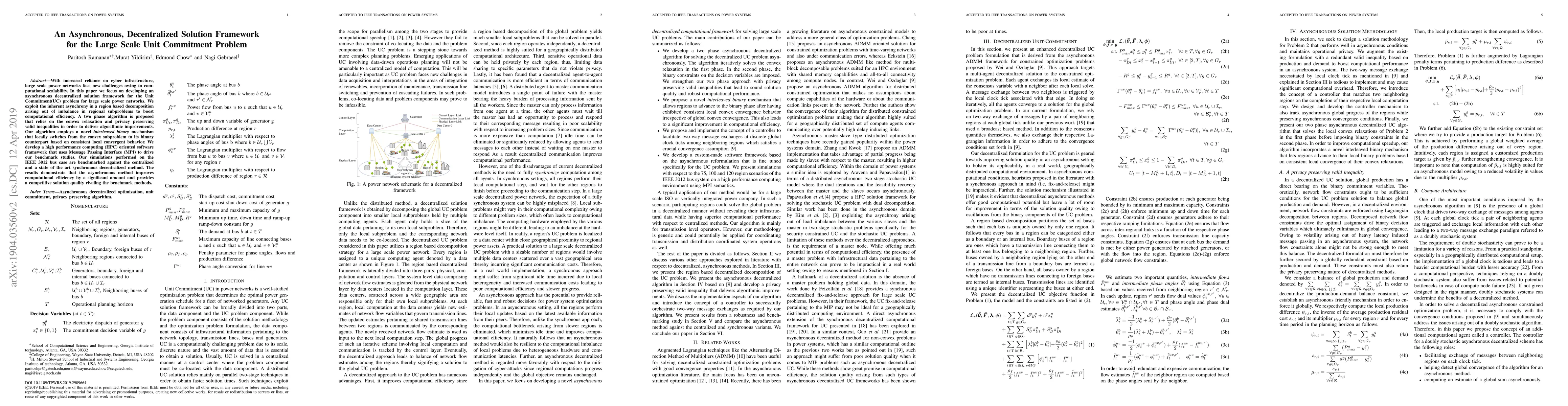 With increased reliance on cyber infrastructure, large scale power networks face new challenges owing to computational scalability. In this paper we focus on developing an asynchronous decentralized solution framework for the Unit Commitment(UC) problem for large scale power networks. We exploit the inherent asynchrony in a region based decomposition arising out of imbalance in regional subproblems to boost computational efficiency. A two phase algorithm is proposed that relies on the convex relaxation and privacy preserving valid inequalities in order to deliver algorithmic improvements. Our algorithm employs a novel interleaved binary mechanism that locally switches from the convex subproblem to its binary counterpart based on consistent local convergent behavior. We develop a high performance computing (HPC) oriented software framework that uses Message Passing Interface (MPI) to drive our benchmark studies. Our simulations performed on the IEEE 3012 bus case are benchmarked against the centralized and a state of the art synchronous decentralized method. The results demonstrate that the asynchronous method improves computational efficiency by a significant amount and provides a competitive solution quality rivaling the benchmark methods.