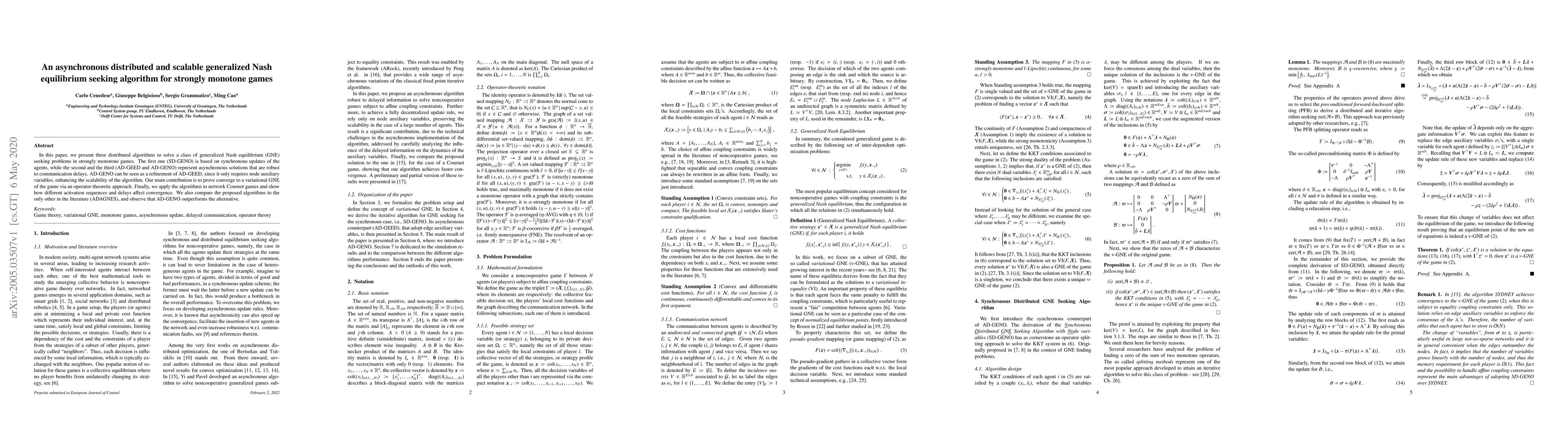 In this paper, we present three distributed algorithms to solve a class of generalized Nash equilibrium (GNE) seeking problems in strongly monotone games. The first one (SD-GENO) is based on synchronous updates of the agents, while the second and the third (AD-GEED and AD-GENO) represent asynchronous solutions that are robust to communication delays. AD-GENO can be seen as a refinement of AD-GEED, since it only requires node auxiliary variables, enhancing the scalability of the algorithm. Our main contribution is to prove converge to a variational GNE of the game via an operator-theoretic approach. Finally, we apply the algorithms to network Cournot games and show how different activation sequences and delays affect convergence. We also compare the proposed algorithms to the only other in the literature (ADAGNES), and observe that AD-GENO outperforms the alternative.