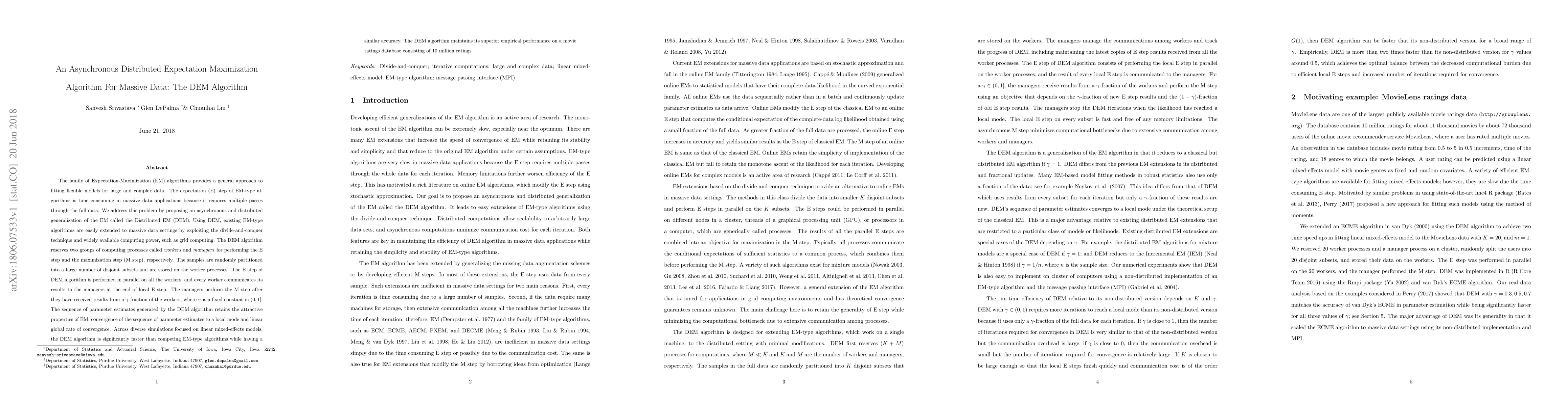 The family of Expectation-Maximization (EM) algorithms provides a general approach to fitting flexible models for large and complex data. The expectation (E) step of EM-type algorithms is time-consuming in massive data applications because it requires multiple passes through the full data. We address this problem by proposing an asynchronous and distributed generalization of the EM called the Distributed EM (DEM). Using DEM, existing EM-type algorithms are easily extended to massive data settings by exploiting the divide-and-conquer technique and widely available computing power, such as grid computing. The DEM algorithm reserves two groups of computing processes called \emph{workers} and \emph{managers} for performing the E step and the maximization step (M step), respectively. The samples are randomly partitioned into a large number of disjoint subsets and are stored on the worker processes. The E step of DEM algorithm is performed in parallel on all the workers, and every worker communicates its results to the managers at the end of local E step. The managers perform the M step after they have received results from a $\gamma$-fraction of the workers, where $\gamma$ is a fixed constant in $(0, 1]$. The sequence of parameter estimates generated by the DEM algorithm retains the attractive properties of EM: convergence of the sequence of parameter estimates to a local mode and linear global rate of convergence. Across diverse simulations focused on linear mixed-effects models, the DEM algorithm is significantly faster than competing EM-type algorithms while having a similar accuracy. The DEM algorithm maintains its superior empirical performance on a movie ratings database consisting of 10 million ratings.