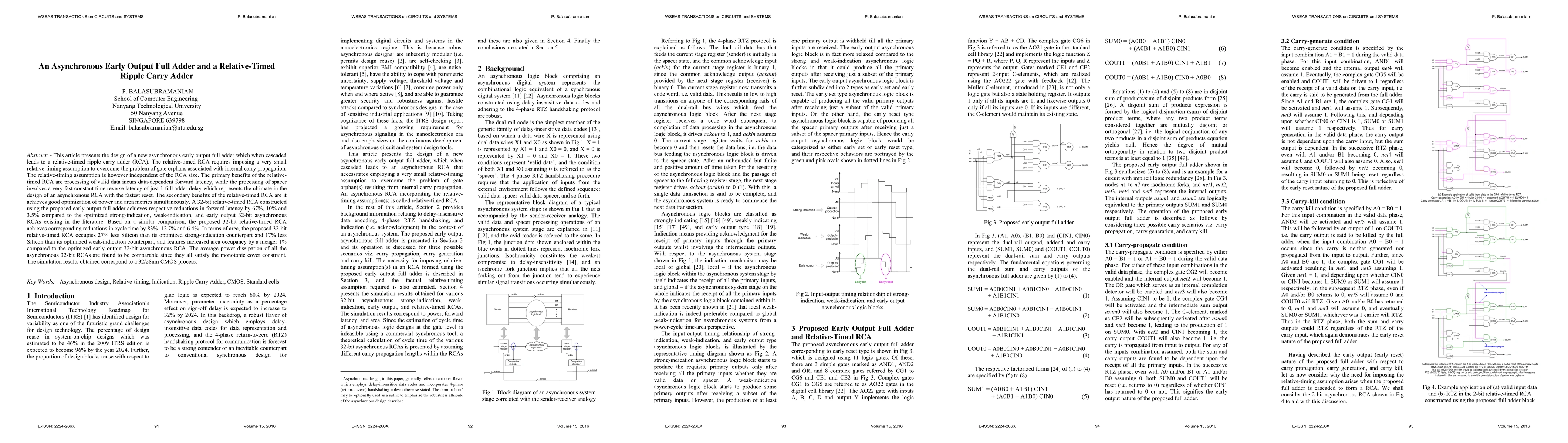This paper introduces a novel asynchronous early output full adder and a relative-timed ripple carry adder (RCA) that significantly reduces latency and optimizes power and area metrics. The design achieves substantial reductions in forward latency, cycle time, and area compared to existing asynchronous RCAs, while maintaining comparable power dissipation.