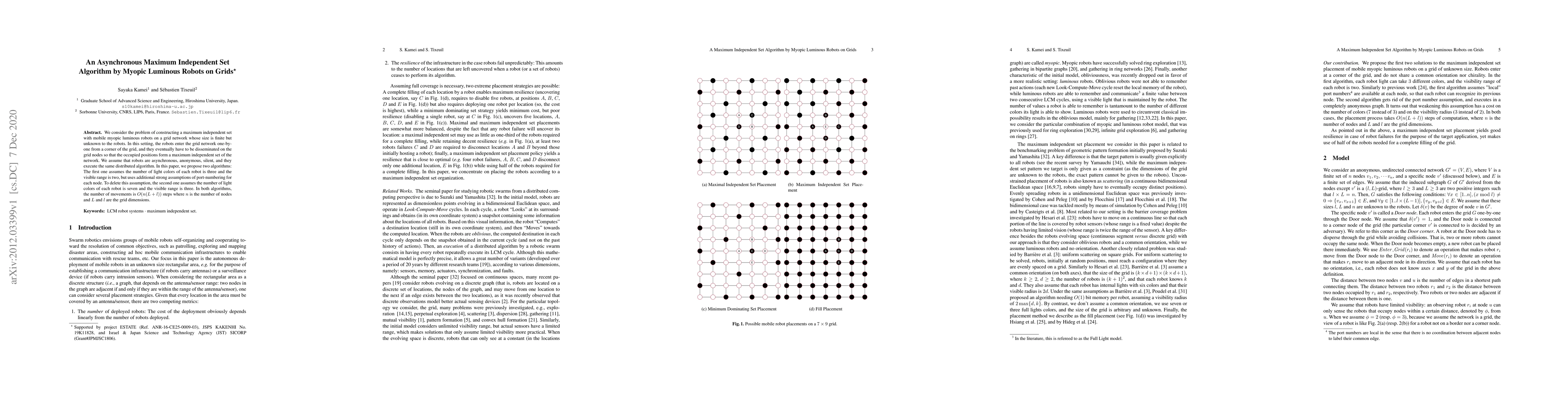 Researchers propose two algorithms for a maximum independent set problem using asynchronous robots on a grid network, achieving O(n(L+l)) steps in movement, without assuming node port numbers.