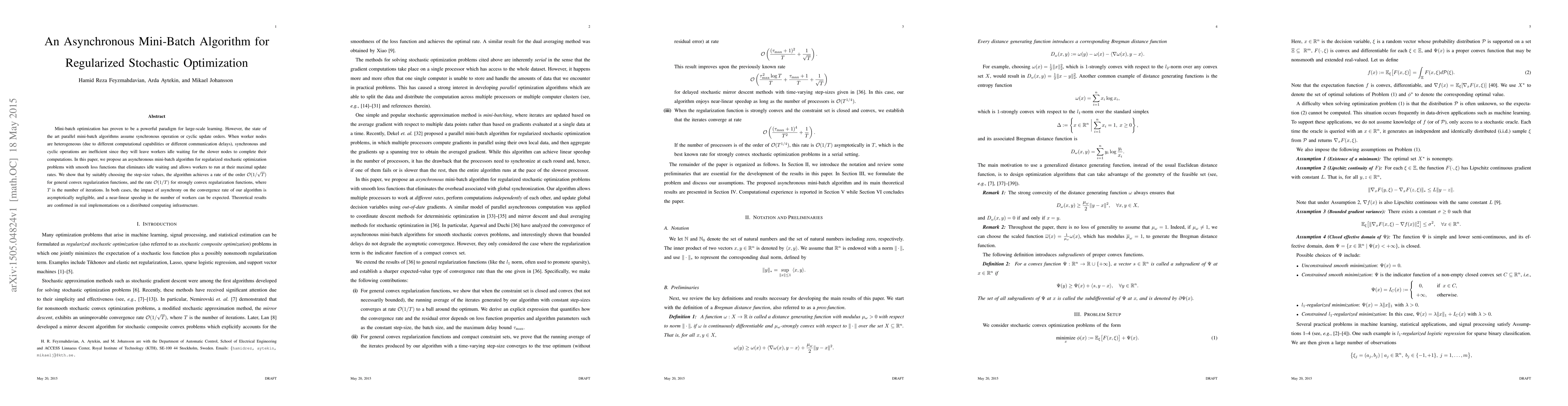 This paper proposes an asynchronous mini-batch algorithm for large-scale regularized stochastic optimization, addressing inefficiencies in synchronous methods by allowing workers to operate at their maximal rates. The algorithm achieves convergence rates of $O(1/\sqrt{T})$ and $O(1/T)$ for general and strongly convex regularization, respectively, with negligible impact from asynchrony.