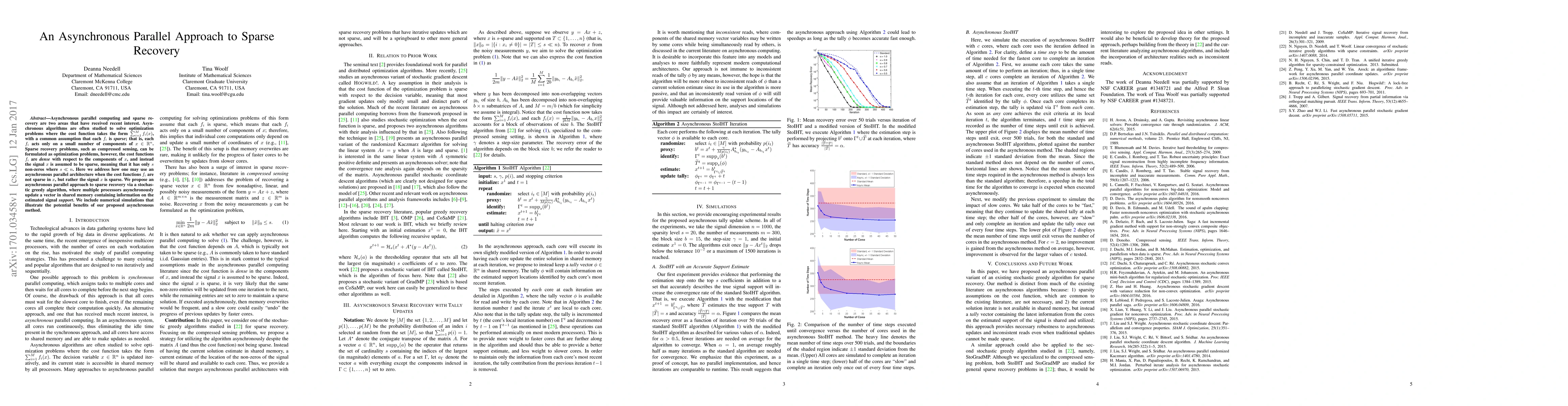 This paper proposes an asynchronous parallel approach for sparse recovery using a stochastic greedy algorithm, where multiple processors update a shared memory vector to estimate signal support. Numerical simulations demonstrate the potential benefits of this method.