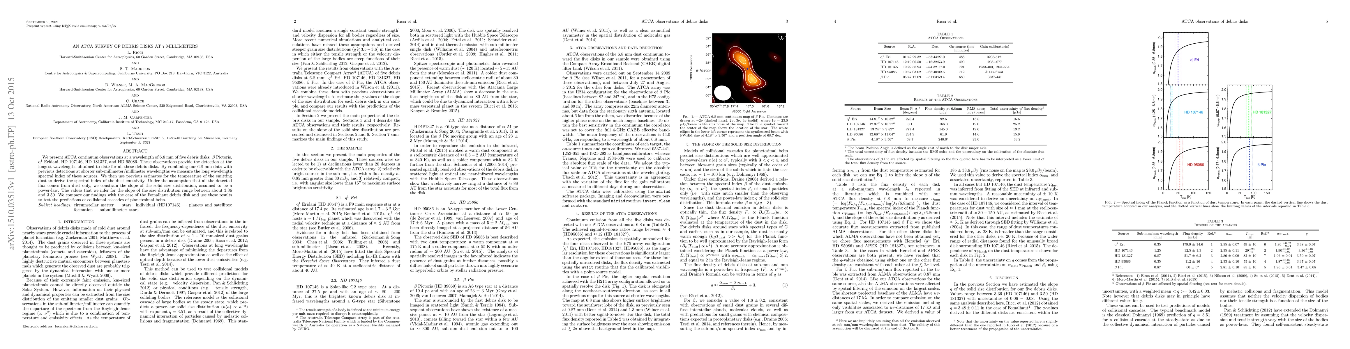 We present ATCA continuum observations at a wavelength of 6.8 mm of five debris disks: $\beta$ Pictoris, q$^1$ Eridani, HD 107146, HD 181327, and HD 95086. These observations provide the detection at the longest wavelengths obtained to date for all these debris disks. By combining our 6.8 mm data with previous detections at shorter sub-millimeter/millimeter wavelengths we measure the long wavelength spectral index of these sources. We then use previous estimates for the temperature of the emitting dust to derive the spectral index of the dust emissivity. Under the assumption that all the detected flux comes from dust only, we constrain the slope of the solid size distribution, assumed to be a power-law. The values that we infer for the slope of the size distribution range between about 3.36 and 3.50. We compare our findings with the case of the Fomalhaut debris disk and use these results to test the predictions of collisional cascades of planetesimal belts.
