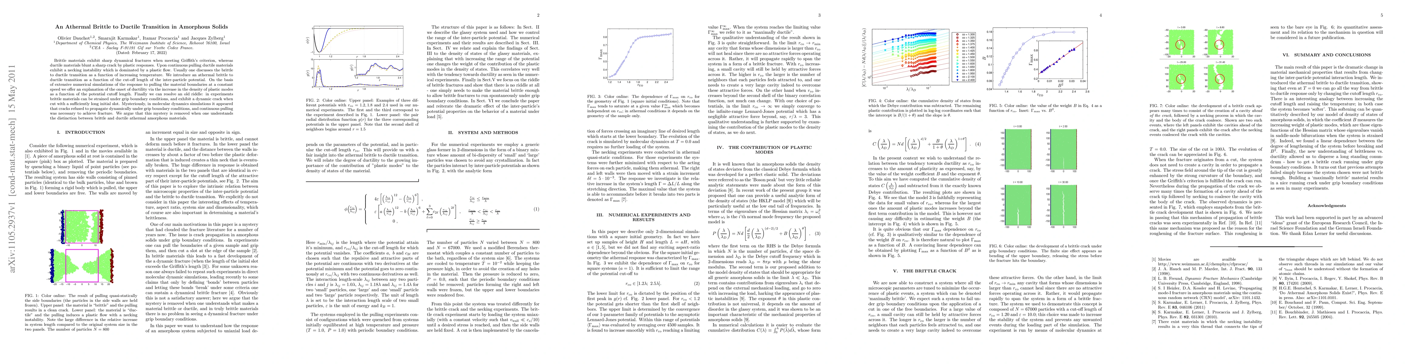 Brittle materials exhibit sharp dynamical fractures when meeting Griffith's criterion, whereas ductile materials blunt a sharp crack by plastic responses. Upon continuous pulling ductile materials exhibit a necking instability which is dominated by a plastic flow. Usually one discusses the brittle to ductile transition as a function of increasing temperature. We introduce an athermal brittle to ductile transition as a function of the cut-off length of the inter-particle potential. On the basis of extensive numerical simulations of the response to pulling the material boundaries at a constant speed we offer an explanation of the onset of ductility via the increase in the density of plastic modes as a function of the potential cutoff length. Finally we can resolve an old riddle: in experiments brittle materials can be strained under grip boundary conditions, and exhibit a dynamic crack when cut with a sufficiently long initial slot. Mysteriously, in molecular dynamics simulations it appeared that cracks refused to propagate dynamically under grip boundary conditions, and continuous pulling was necessary to achieve fracture. We argue that this mystery is removed when one understands the distinction between brittle and ductile athermal amorphous materials.