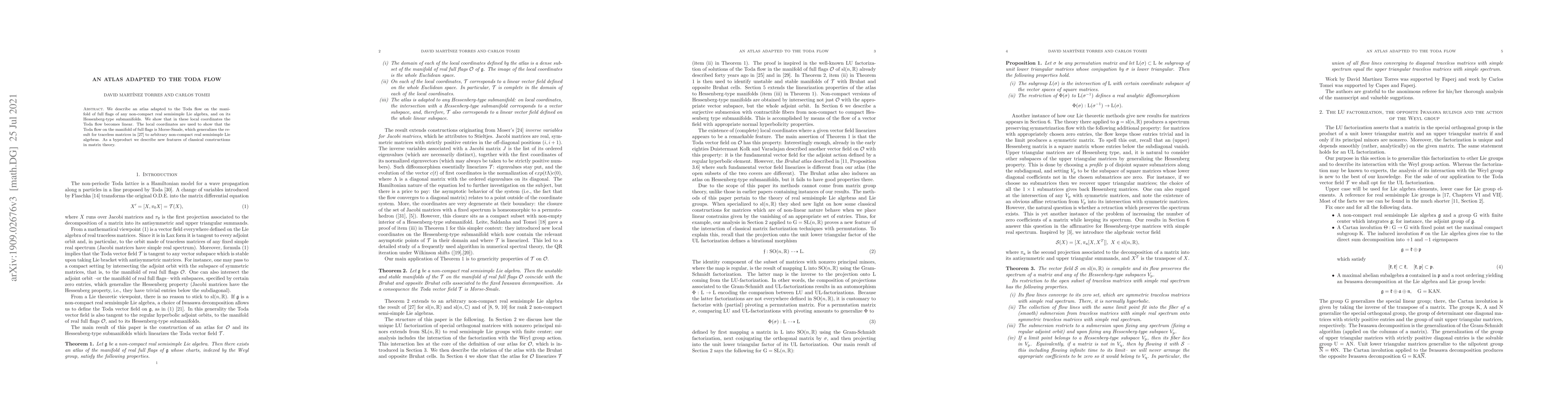 We introduce an atlas adapted to the Toda flow on the manifold of full flags of any non-compact real semisimple Lie algebra, and on its Hessenberg-type submanifolds. In our local coordinates the Toda flow becomes linear. We use these new coordinates to show that the Toda flow on the manifold of full flags is Morse-Smale, which generalizes the main result of \cite{CSS1} to arbitrary non-compact real semisimple Lie algebras. As a byproduct we describe new features of classical constructions in matrix theory.