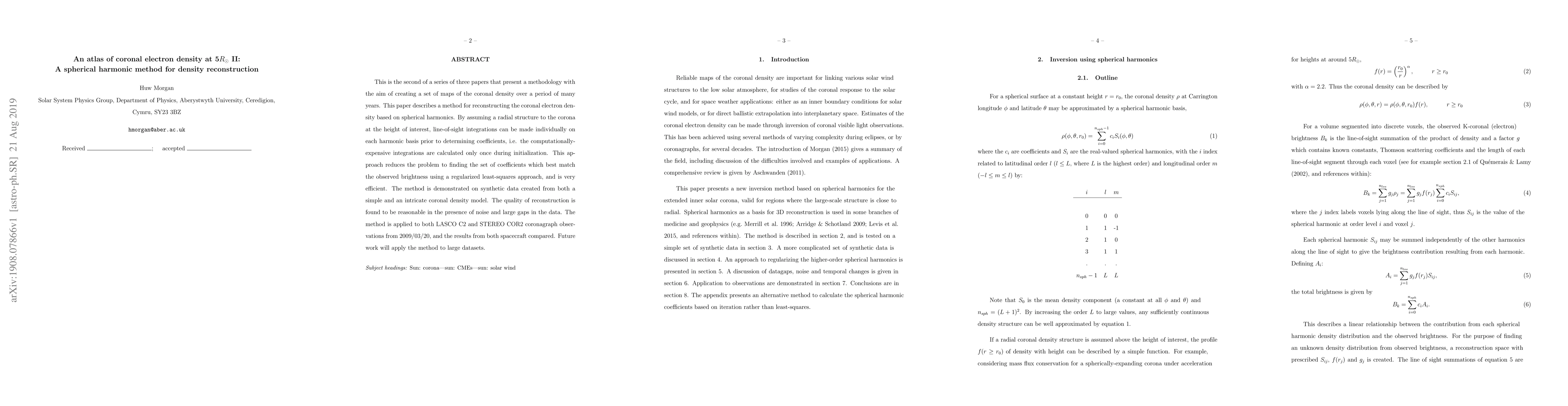 This is the second of a series of three papers that present a methodology with the aim of creating a set of maps of the coronal density over a period of many years. This paper describes a method for reconstructing the coronal electron density based on spherical harmonics. By assuming a radial structure to the corona at the height of interest, line-of-sight integrations can be made individually on each harmonic basis prior to determining coefficients, i.e. the computationally-expensive integrations are calculated only once during initialization. This approach reduces the problem to finding the set of coefficients which best match the observed brightness using a regularized least-squares approach, and is very efficient. The method is demonstrated on synthetic data created from both a simple and an intricate coronal density model. The quality of reconstruction is found to be reasonable in the presence of noise and large gaps in the data. The method is applied to both LASCO C2 and STEREO COR2 coronagraph observations from 2009/03/20, and the results from both spacecraft compared. Future work will apply the method to large datasets.