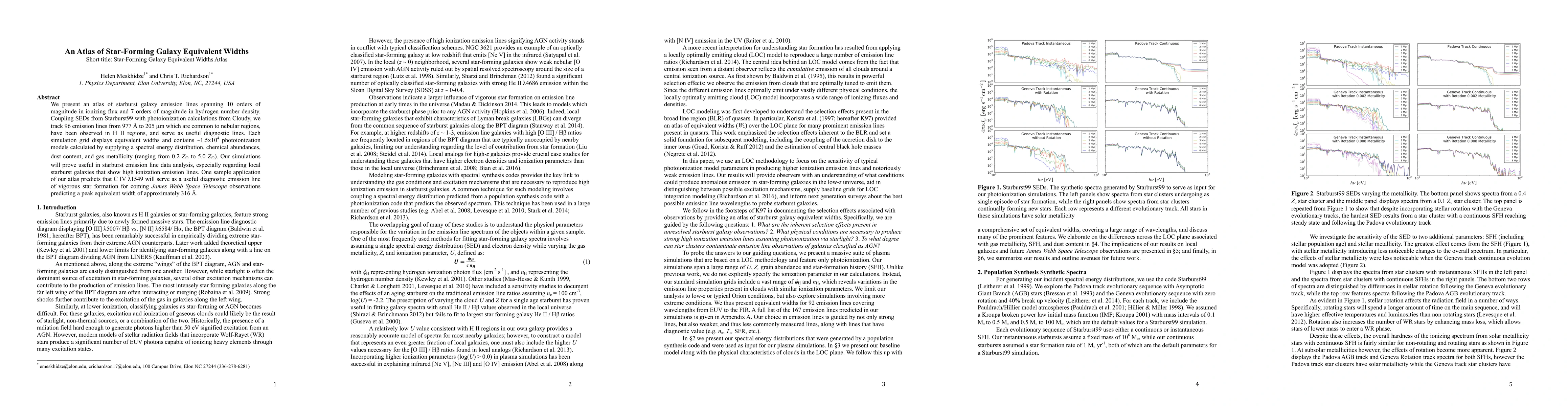 We present an atlas of starburst galaxy emission lines spanning 10 orders of magnitude in ionizing flux and 7 orders of magnitude in hydrogen number density. Coupling SEDs from Starburst99 with photoionization calculations from Cloudy, we track 96 emission lines from 977 {\AA} to 205 m which are common to nebular regions, have been observed in H II regions, and serve as useful diagnostic lines. Each simulation grid displays equivalent widths and contains ~1.5x10$^4$ photoionization models calculated by supplying a spectral energy distribution, chemical abundances, dust content, and gas metallicity (ranging from 0.2 Z$\odot$ to 5.0 Z$\odot$). Our simulations will prove useful in starburst emission line data analysis, especially regarding local starburst galaxies that show high ionization emission lines. One sample application of our atlas predicts that C IV $\lambda$1549 will serve as a useful diagnostic emission line of vigorous star formation for coming James Webb Space Telescope observations predicting a peak equivalent width of approximately 316 {\AA}.