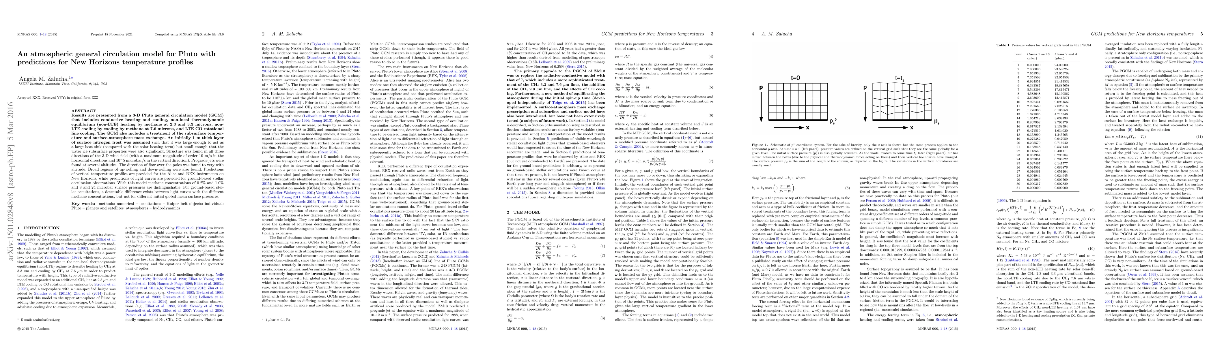 Results are presented from a 3-D Pluto general circulation model (GCM) that includes conductive heating and cooling, non-local thermodynamic equilibrium (non-LTE) heating by methane at 2.3 and 3.3 microns, non-LTE cooling by cooling by methane at 7.6 microns, and LTE CO rotational line cooling. The GCM also includes a treatment of the subsurface temperature and surface-atmosphere mass exchange. An initially 1 m thick layer of surface nitrogen frost was assumed such that it was large enough to act as a large heat sink (compared with the solar heating term) but small enough that the water ice subsurface properties were also significant. Structure was found in all three directions of the 3-D wind field (with a maximum magnitude of order 10 m/s in the horizontal directions and 10$^-5$ microbar/s in the vertical direction). Prograde jets were found at several altitudes. The direction of flow over the poles was found to very with altitude. Broad regions of up-welling and down-welling were also found. Predictions of vertical temperature profiles are provided for the Alice and REX instruments on New Horizons, while predictions of light curves are provided for ground-based stellar occultation observations. With this model methane concentrations of 0.2% and 1.0% and 8 and 24 microbar surface pressures are distinguishable. For ground-based stellar occultations, a detectable difference exists between light curves with the different methane concentrations, but not for different initial global mean surface pressures.