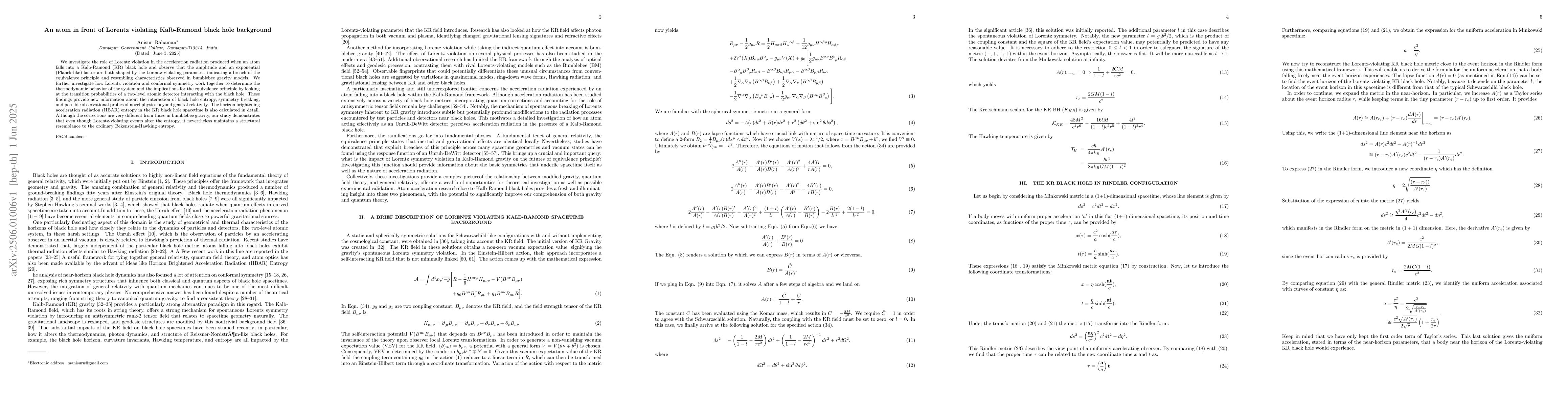 We investigate the role of Lorentz violation in the acceleration radiation produced when an atom falls into a Kalb-Ramond (KR) black hole and observe that the amplitude and an exponential (Planck-like) factor are both shaped by the Lorentz-violating parameter, indicating a breach of the equivalence principle and resembling characteristics observed in bumblebee gravity models. We further investigate how Lorentz violation and conformal symmetry work together to determine the thermodynamic behavior of the system and the implications for the equivalence principle by looking at the transition probabilities of a two-level atomic detector interacting with the black hole. These findings provide new information about the interaction of black hole entropy, symmetry breaking, and possible observational probes of novel physics beyond general relativity. The horizon brightening acceleration radiation (HBAR) entropy in the KR black hole spacetime is also calculated in detail. Although the corrections are very different from those in bumblebee gravity, our study demonstrates that even though Lorentz-violating events alter the entropy, it nevertheless maintains a structural resemblance to the ordinary Bekenstein-Hawking entropy.