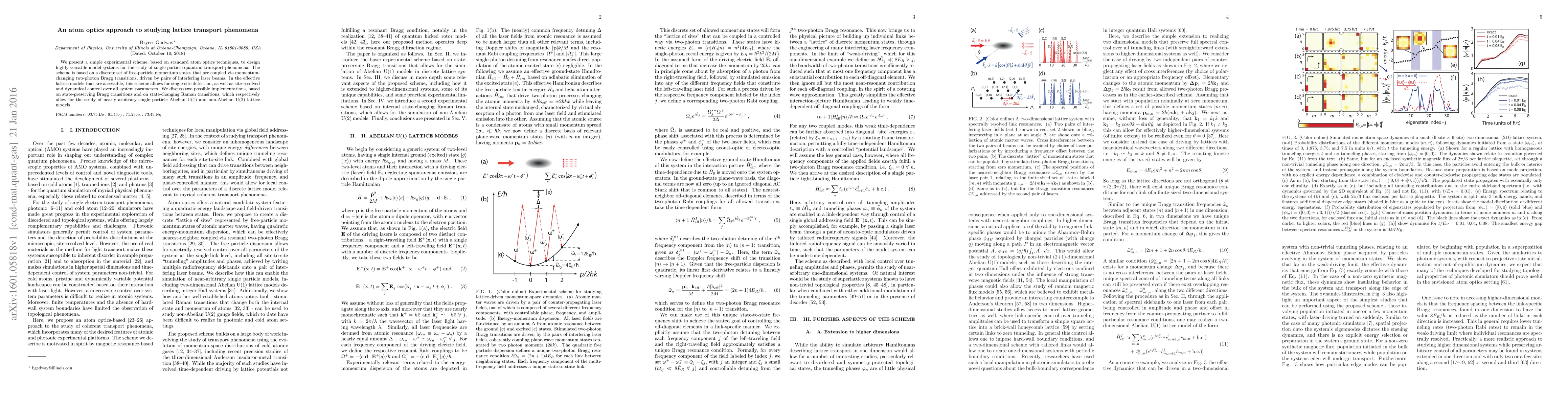 This paper proposes an atom optics method to create versatile model systems for studying single-particle quantum transport phenomena using coupled free-particle momentum states via laser-driven Bragg transitions. The scheme enables single-site detection and control over system parameters, with implementations for Abelian U(1) and non-Abelian U(2) lattice models.