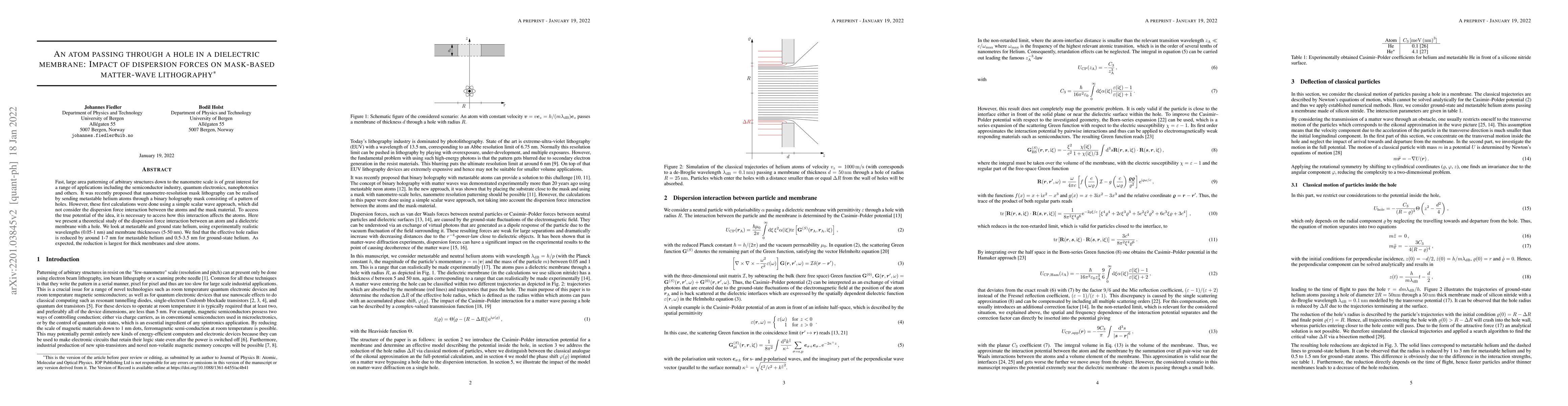 Researchers studied how dispersion forces affect helium atoms passing through a dielectric membrane with holes, finding that they reduce the effective hole radius by 1-7nm for metastable helium and 0.5-3.5nm for ground-state helium.