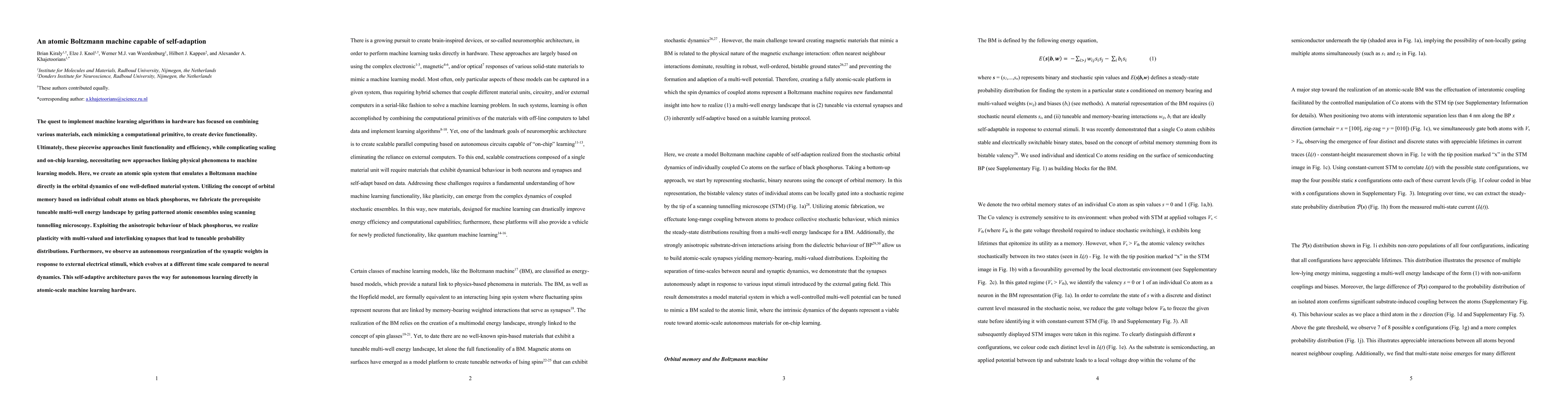 The Boltzmann Machine (BM) is a neural network composed of stochastically firing neurons that can learn complex probability distributions by adapting the synaptic interactions between the neurons. BMs represent a very generic class of stochastic neural networks that can be used for data clustering, generative modelling and deep learning. A key drawback of software-based stochastic neural networks is the required Monte Carlo sampling, which scales intractably with the number of neurons. Here, we realize a physical implementation of a BM directly in the stochastic spin dynamics of a gated ensemble of coupled cobalt atoms on the surface of semiconducting black phosphorus. Implementing the concept of orbital memory utilizing scanning tunnelling microscopy, we demonstrate the bottom-up construction of atomic ensembles whose stochastic current noise is defined by a reconfigurable multi-well energy landscape. Exploiting the anisotropic behaviour of black phosphorus, we build ensembles of atoms with two well-separated intrinsic time scales that represent neurons and synapses. By characterizing the conditional steady-state distribution of the neurons for given synaptic configurations, we illustrate that an ensemble can represent many distinct probability distributions. By probing the intrinsic synaptic dynamics, we reveal an autonomous reorganization of the synapses in response to external electrical stimuli. This self-adaptive architecture paves the way for on-chip learning directly in atomic-scale machine learning hardware.