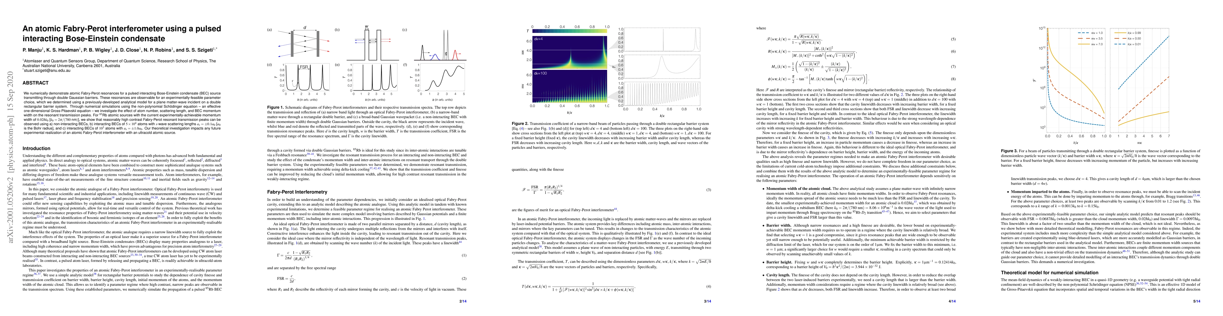 This paper demonstrates the feasibility of atomic Fabry-Perot resonances using a pulsed interacting Bose-Einstein condensate (BEC) through double Gaussian barriers. The study shows that high contrast transmission peaks can be achieved with various BEC configurations, impacting future atomic interferometer experiments.