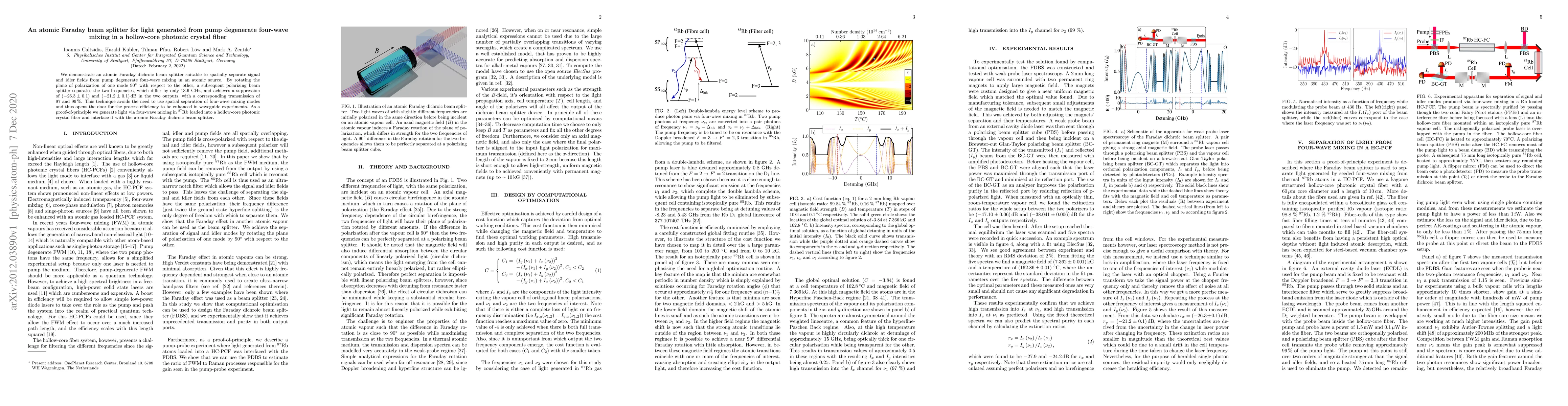 We demonstrate an atomic Faraday dichroic beam splitter suitable to spatially separate signal and idler fields from pump degenerate four-wave mixing in an atomic source. By rotating the plane of polarization of one mode $90^{\circ}$ with respect to the other, a subsequent polarizing beam splitter separates the two frequencies, which differ by only 13.6 GHz, and achieves a suppression of $(-26.3\pm0.1)$ and $(-21.2\pm0.1)$ dB in the two outputs, with a corresponding transmission of 97 and 99 %. This technique avoids the need to use spatial separation of four-wave mixing modes and thus opens the door for the process efficiency to be enhanced in waveguide experiments. As a proof-of-principle we generate light via four-wave mixing in $^{87}$Rb loaded into a hollow-core photonic crystal fiber and interface it with the atomic Faraday dichroic beam splitter.