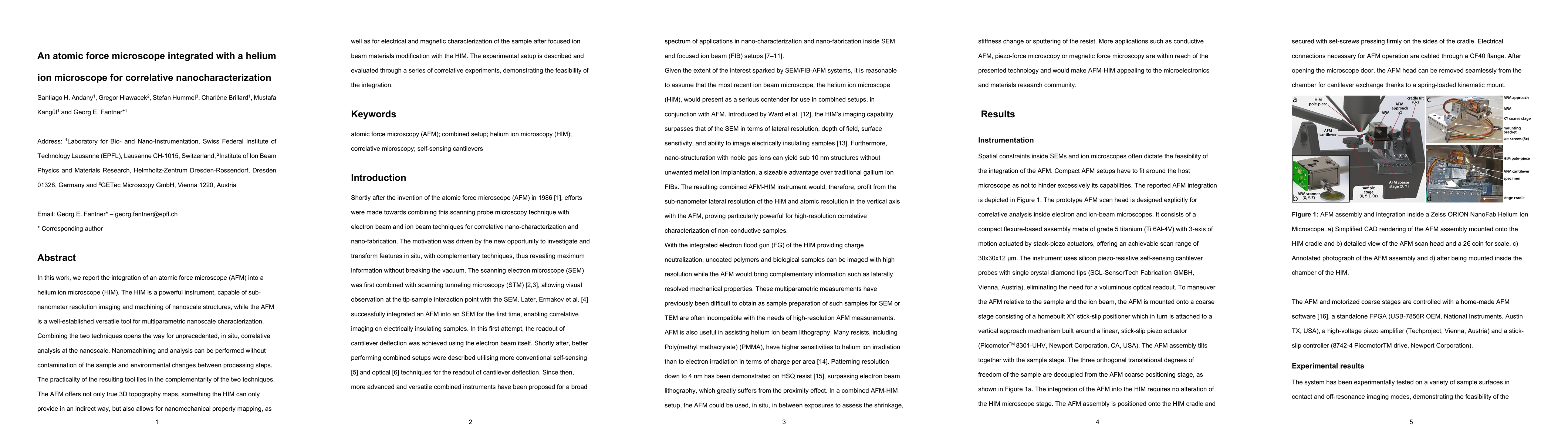 This paper describes the integration of an atomic force microscope (AFM) with a helium ion microscope (HIM) for correlative nanocharacterization, providing in situ analysis and nanomachining capabilities without sample contamination. The combined tool enables complementary nanoscale imaging and mechanical property mapping.