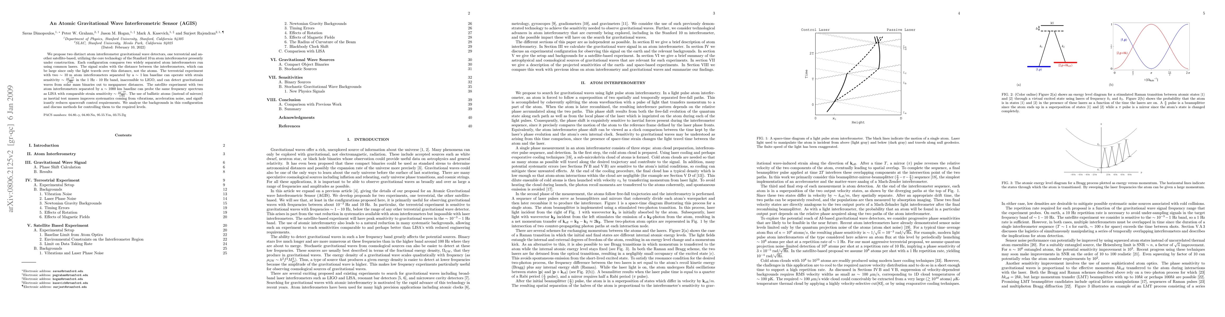 We propose two distinct atom interferometer gravitational wave detectors, one terrestrial and another satellite-based, utilizing the core technology of the Stanford 10 m atom interferometer presently under construction. Each configuration compares two widely separated atom interferometers run using common lasers. The signal scales with the distance between the interferometers, which can be large since only the light travels over this distance, not the atoms. The terrestrial experiment with baseline ~1 km can operate with strain sensitivity ~10^(-19) / Hz^(1/2) in the 1 Hz - 10 Hz band, inaccessible to LIGO, and can detect gravitational waves from solar mass binaries out to megaparsec distances. The satellite experiment with baseline ~1000 km can probe the same frequency spectrum as LISA with comparable strain sensitivity ~10^(-20) / Hz^(1/2). The use of ballistic atoms (instead of mirrors) as inertial test masses improves systematics coming from vibrations, acceleration noise, and significantly reduces spacecraft control requirements. We analyze the backgrounds in this configuration and discuss methods for controlling them to the required levels.