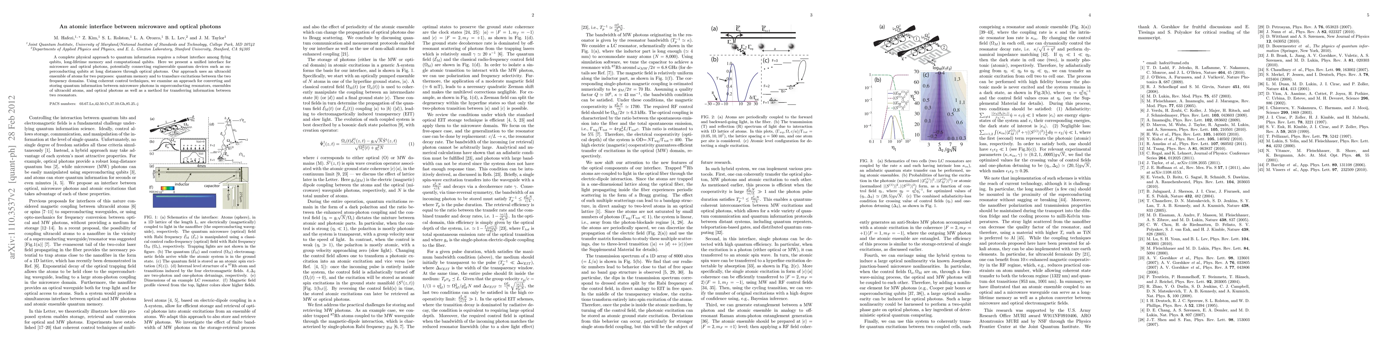 This paper presents an atomic interface that enables quantum information transfer between microwave and optical photons, using an ultracold atomic ensemble for quantum memory and frequency conversion, and demonstrates techniques for storing and transferring quantum information over long distances.
