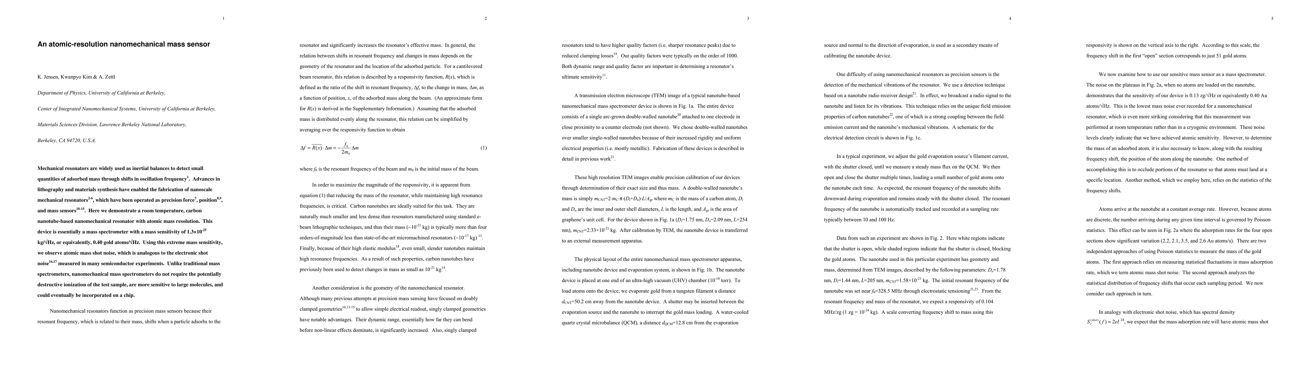 This paper presents a carbon-nanotube-based nanomechanical resonator capable of atomic mass resolution, demonstrating a mass sensitivity of 1.3 x 10^-25 kg Hz^-1/2 and observing atomic mass shot noise, offering a non-destructive, highly sensitive alternative to traditional mass spectrometers.