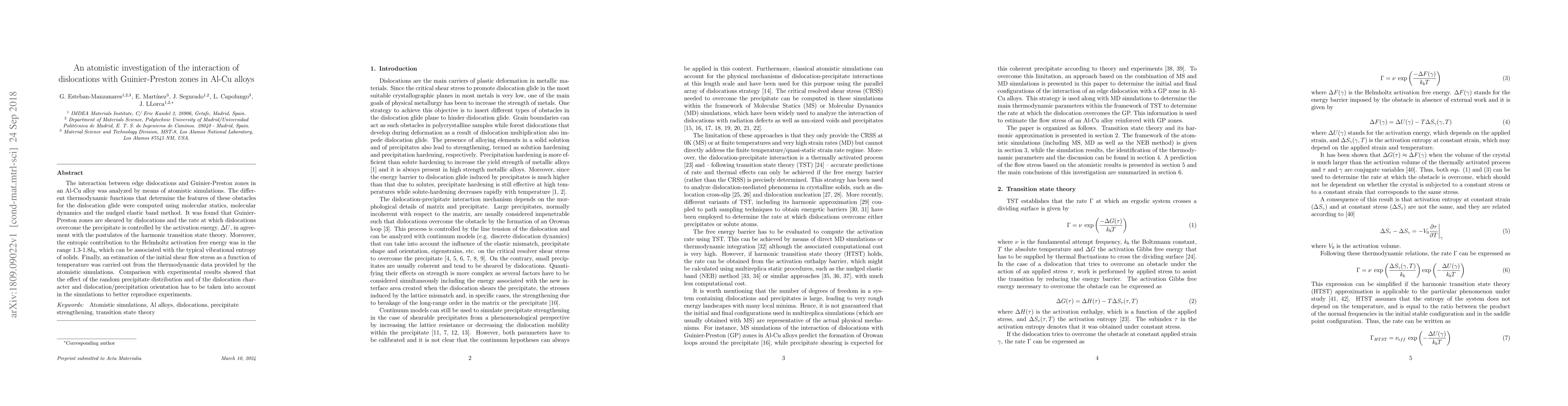 The interaction between edge dislocations and Guinier-Preston zones in an Al-Cu alloy was analyzed by means of atomistic simulations. The different thermodynamic functions that determine the features of these obstacles for the dislocation glide were computed using molecular statics, molecular dynamics and the nudged elastic band method. It was found that Guinier-Preston zones are sheared by dislocations and the rate at which dislocations overcome the precipitate is controlled by the activation energy, $\Delta U$, in agreement with the postulates of the harmonic transition state theory. Moreover, the entropic contribution to the Helmholtz activation free energy was in the range 1.3-1.8$k_b$, which can be associated with the typical vibrational entropy of solids. Finally, an estimation of the initial shear flow stress as a function of temperature was carried out from the thermodynamic data provided by the atomistic simulations. Comparison with experimental results showed that the effect of the random precipitate distribution and of the dislocation character and dislocation/precipitation orientation has to be taken into account in the simulations to better reproduce experiments.
