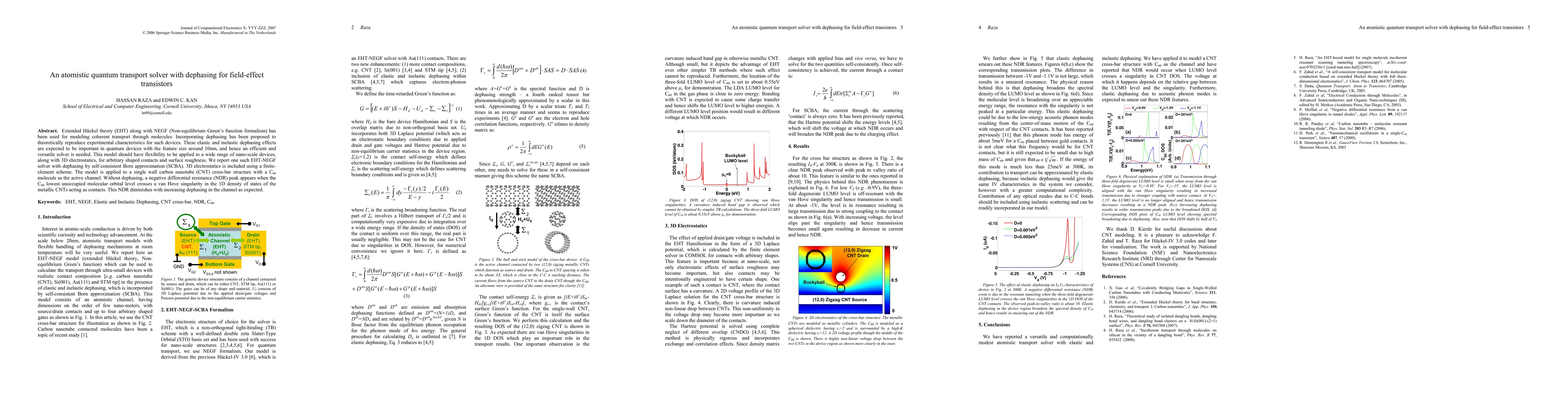 Extended Huckel theory (EHT) along with NEGF (Non-equilibrium Green's function formalism) has been used for modeling coherent transport through molecules. Incorporating dephasing has been proposed to theoretically reproduce experimental characteristics for such devices. These elastic and inelastic dephasing effects are expected to be important in quantum devices with the feature size around 10nm, and hence an efficient and versatile solver is needed. This model should have flexibility to be applied to a wide range of nano-scale devices, along with 3D electrostatics, for arbitrary shaped contacts and surface roughness. We report one such EHT-NEGF solver with dephasing by self-consistent Born approximation (SCBA). 3D electrostatics is included using a finite-element scheme. The model is applied to a single wall carbon nanotube (CNT) cross-bar structure with a C60 molecule as the active channel. Without dephasing, a negative differential resistance (NDR) peak appears when the C60 lowest unoccupied molecular orbital level crosses a van Hove singularity in the 1D density of states of the metallic CNTs acting as contacts. This NDR diminishes with increasing dephasing in the channel as expected.